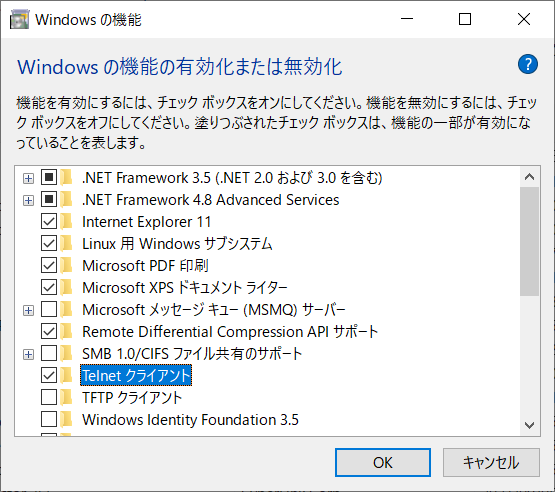 「Telnet クライアント」にチェックを入れOKボタンを押します。