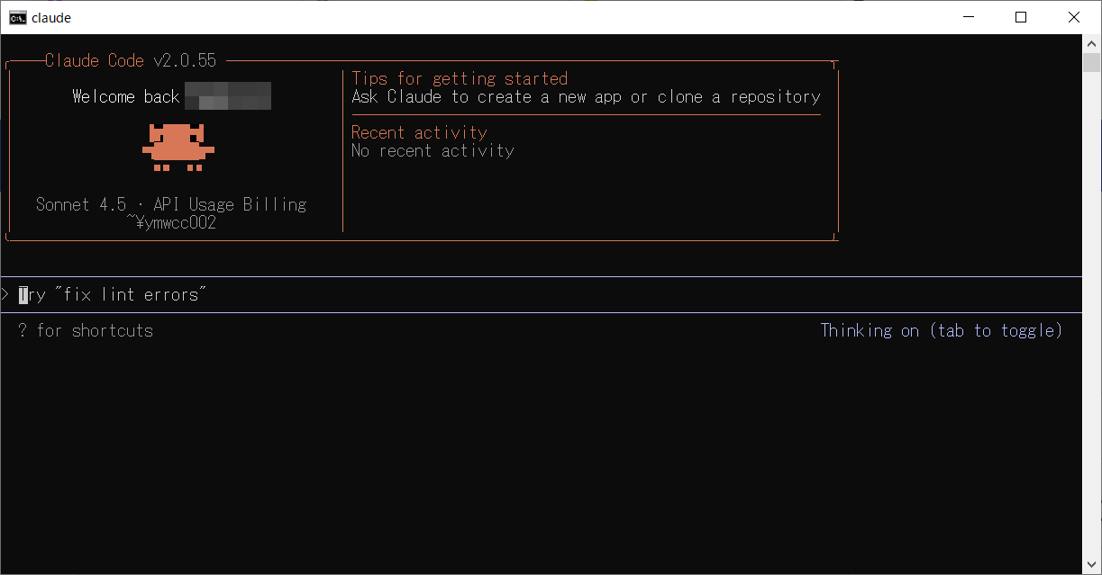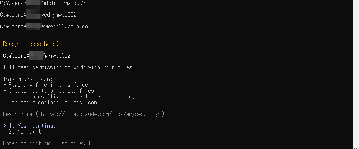 フォルダを作成し作成したフォルダに移動してClaudeを起動します。