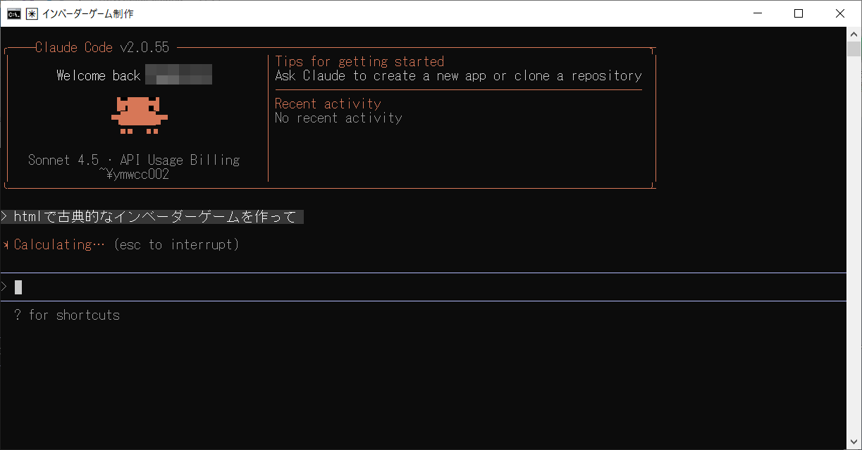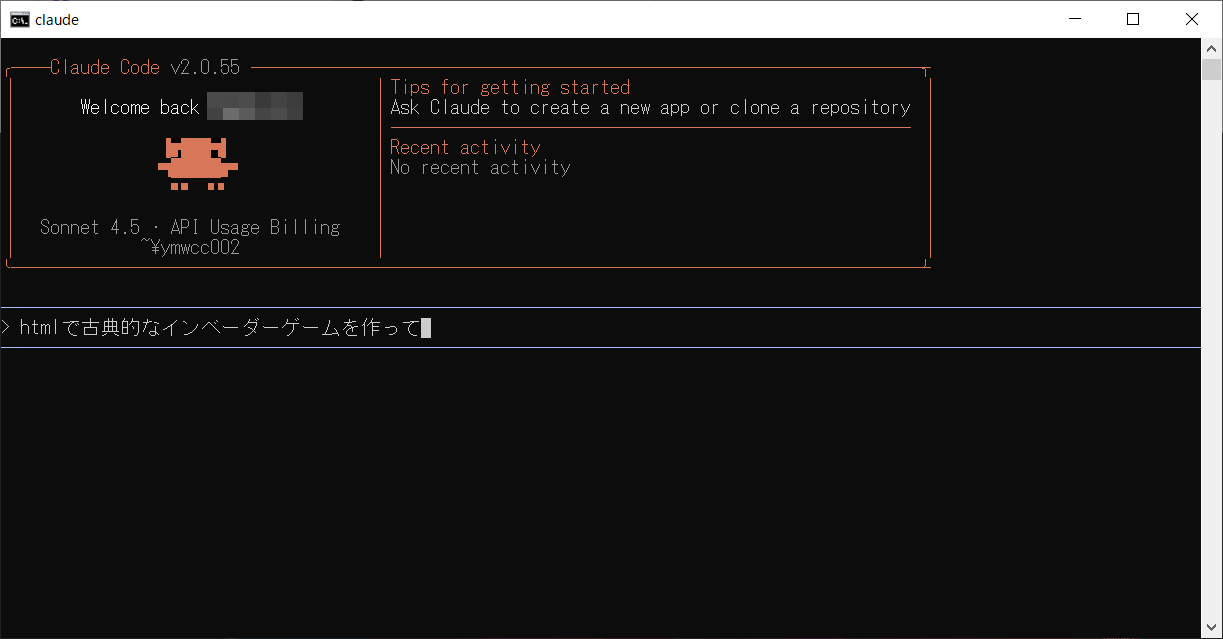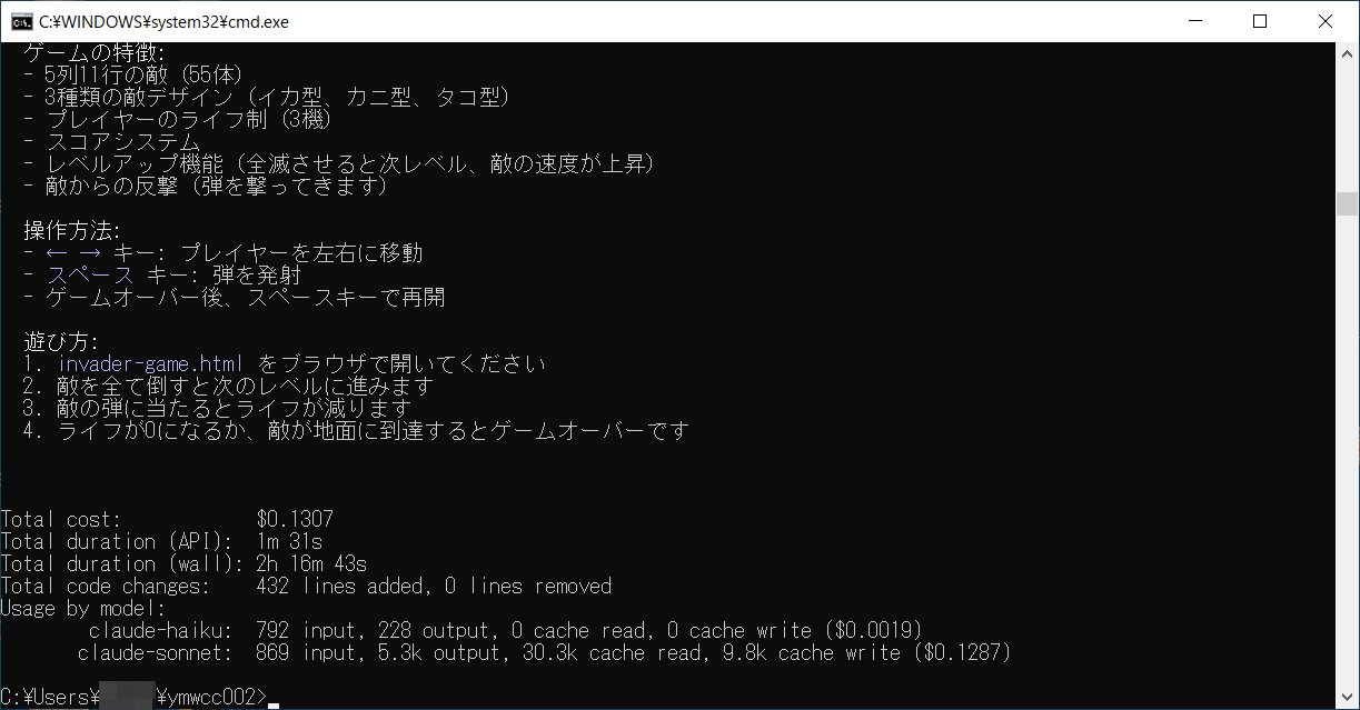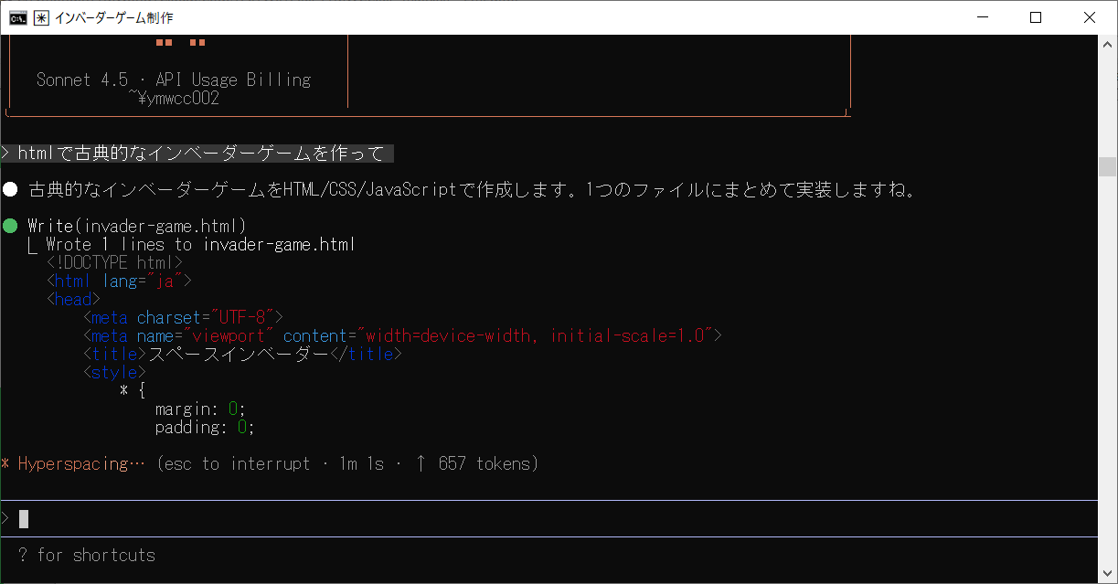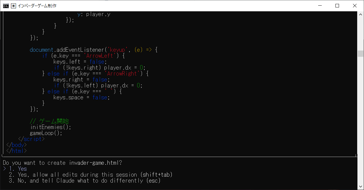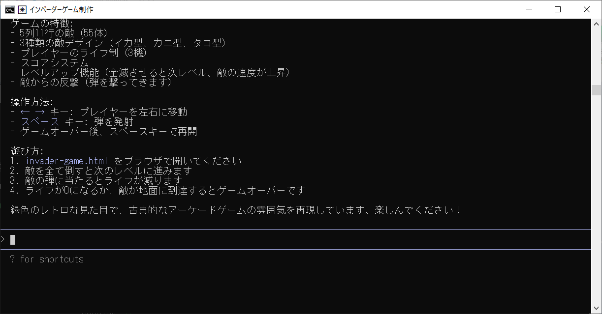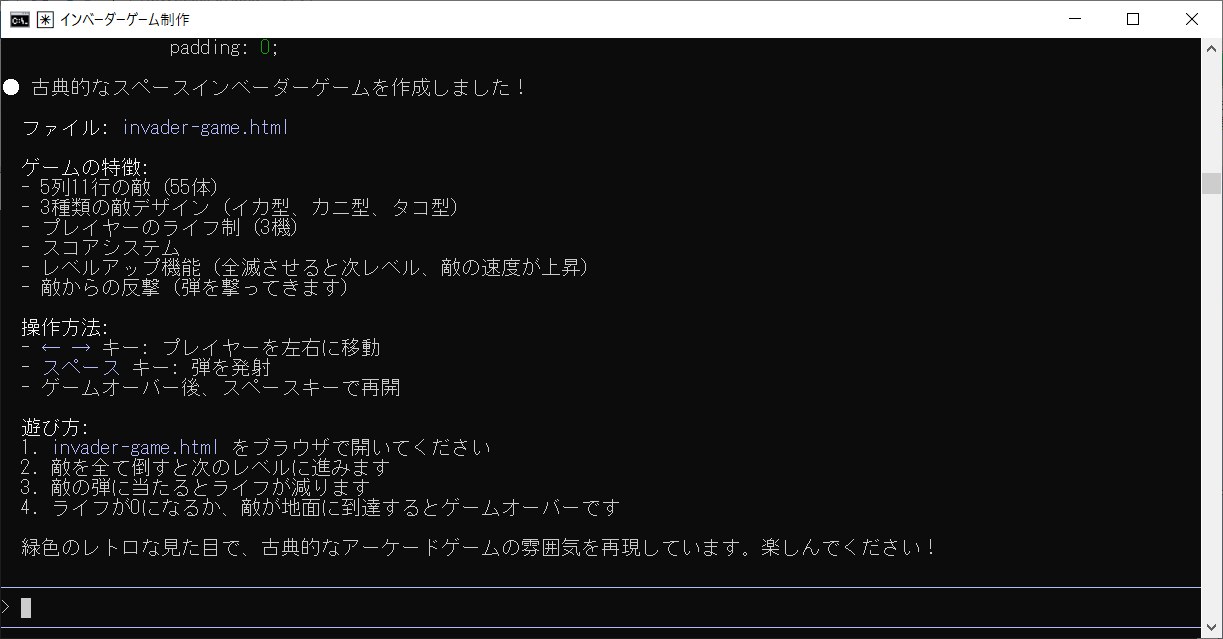 htmlで古典的なインベーダーゲームを作ってと入力しEnterを押します。