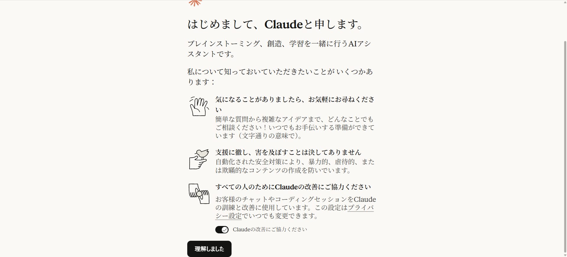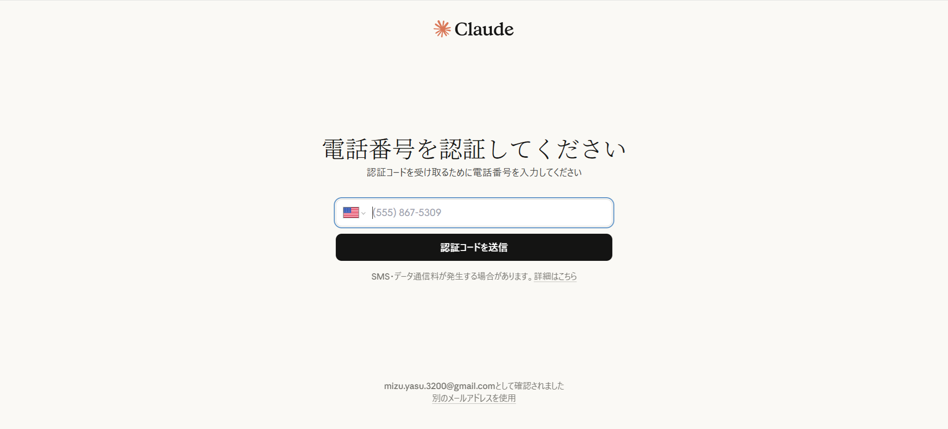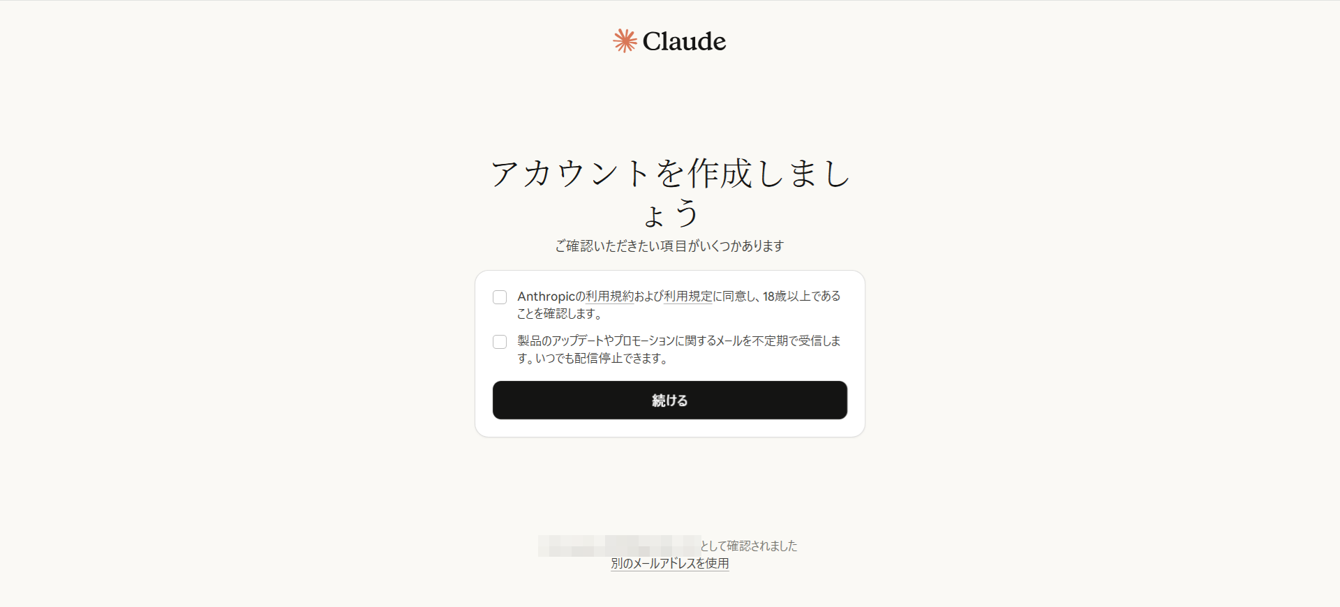 Anthropicの利用規約および利用規定に同意し、18歳以上であることを確認します。にチェックを入れて続けるをクリックします。