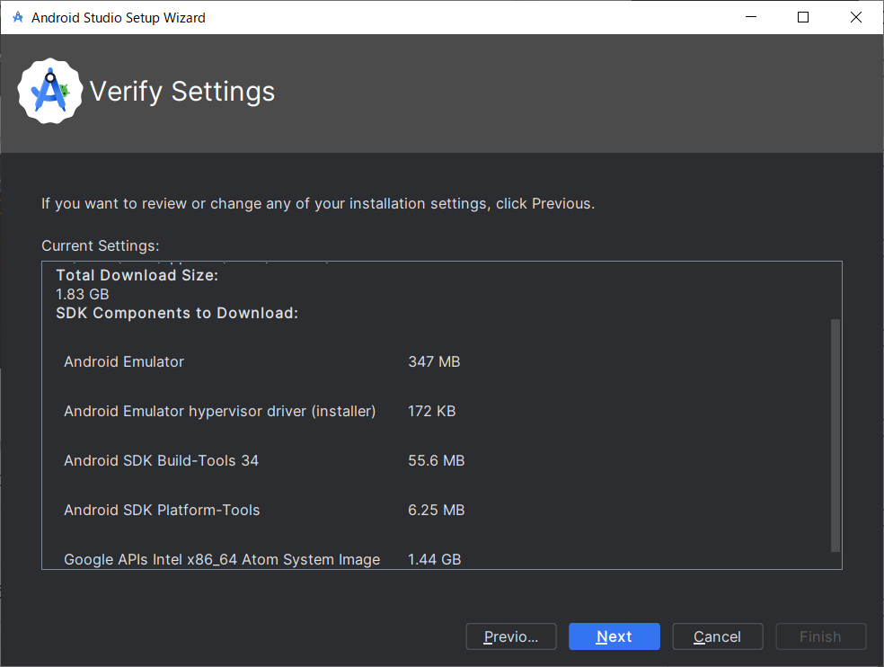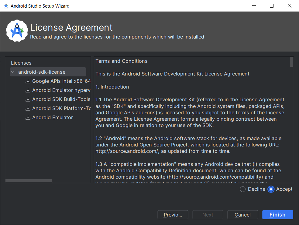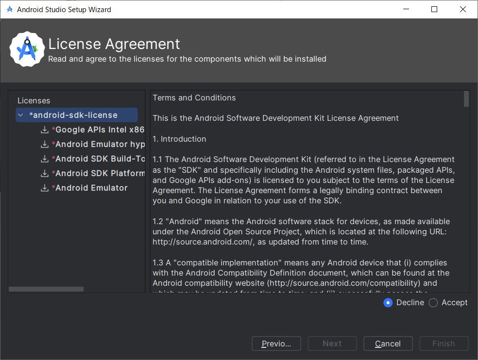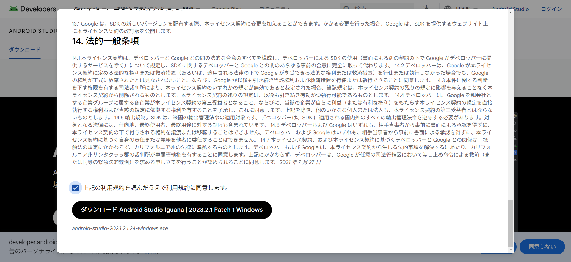 「上記の利用規約を呼んだうえで利用規約に同意します。」をクリックしチェックを入れます。 「ダウンロード Android Studio Iguana | 2023.2.1 Patch 1 Windows」をクリックします。