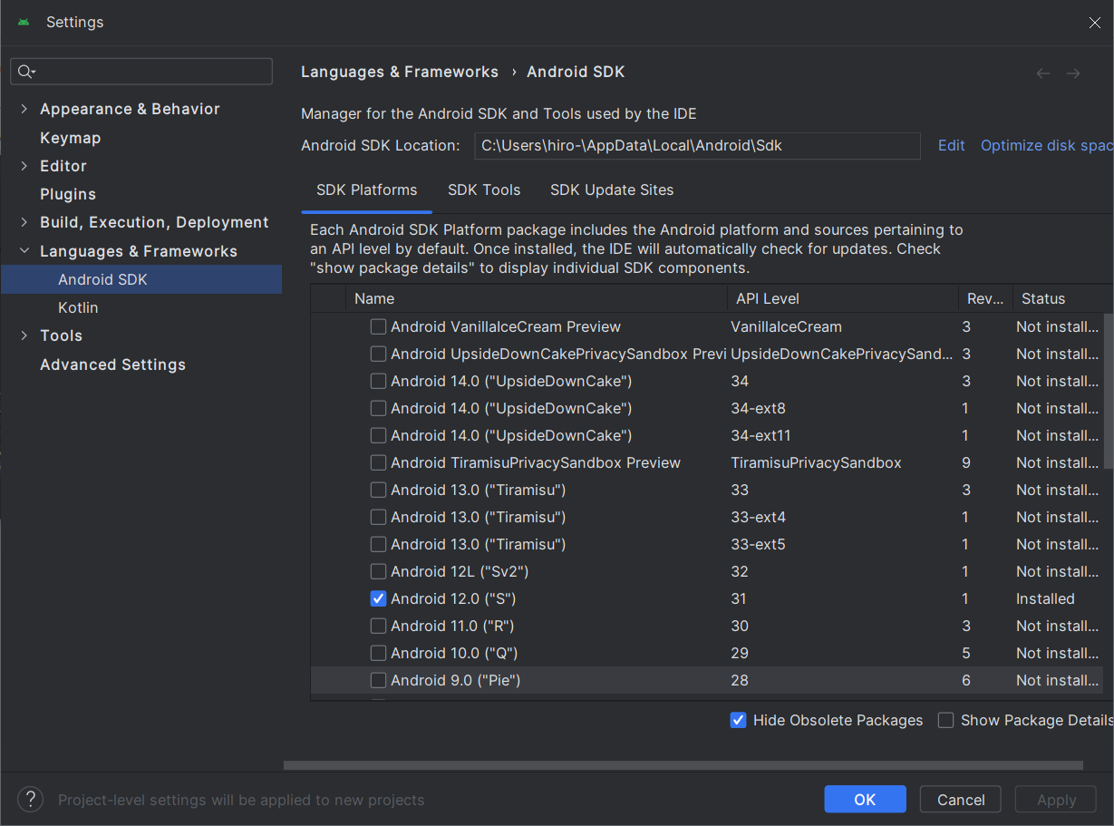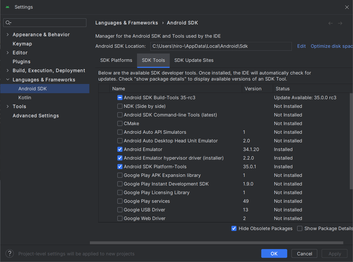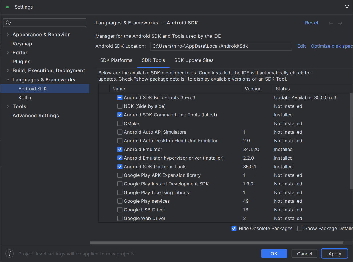 「Android SDK Command-line Tools (latest)」にチェックをして「OK」をクリックします。