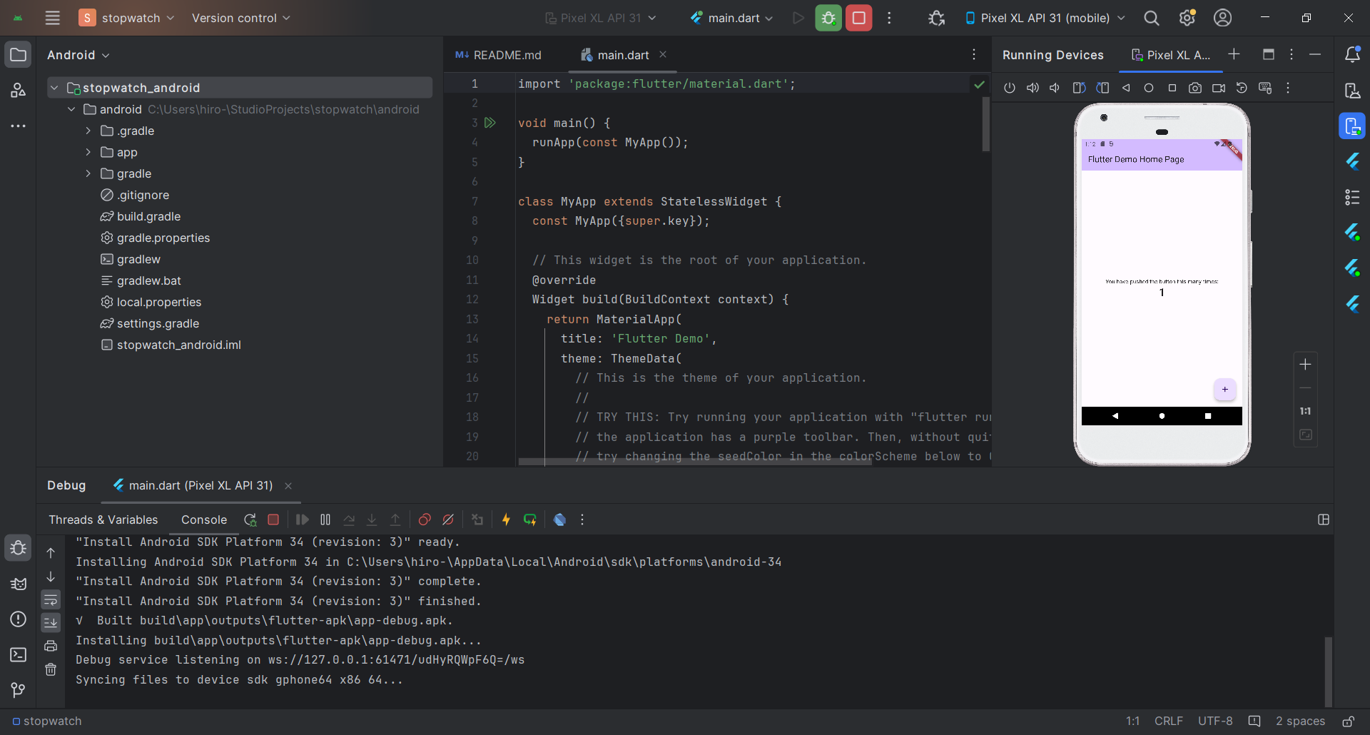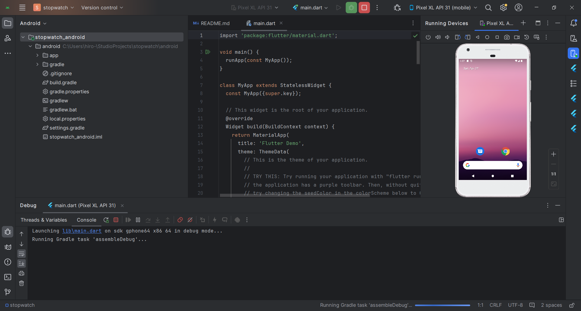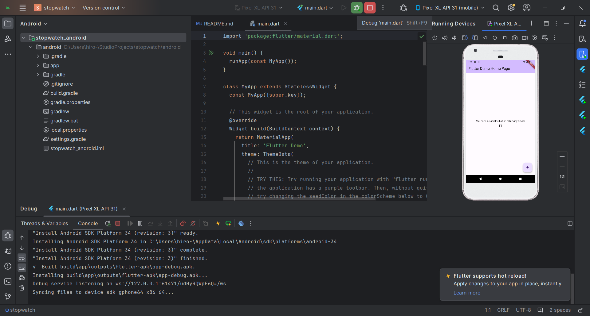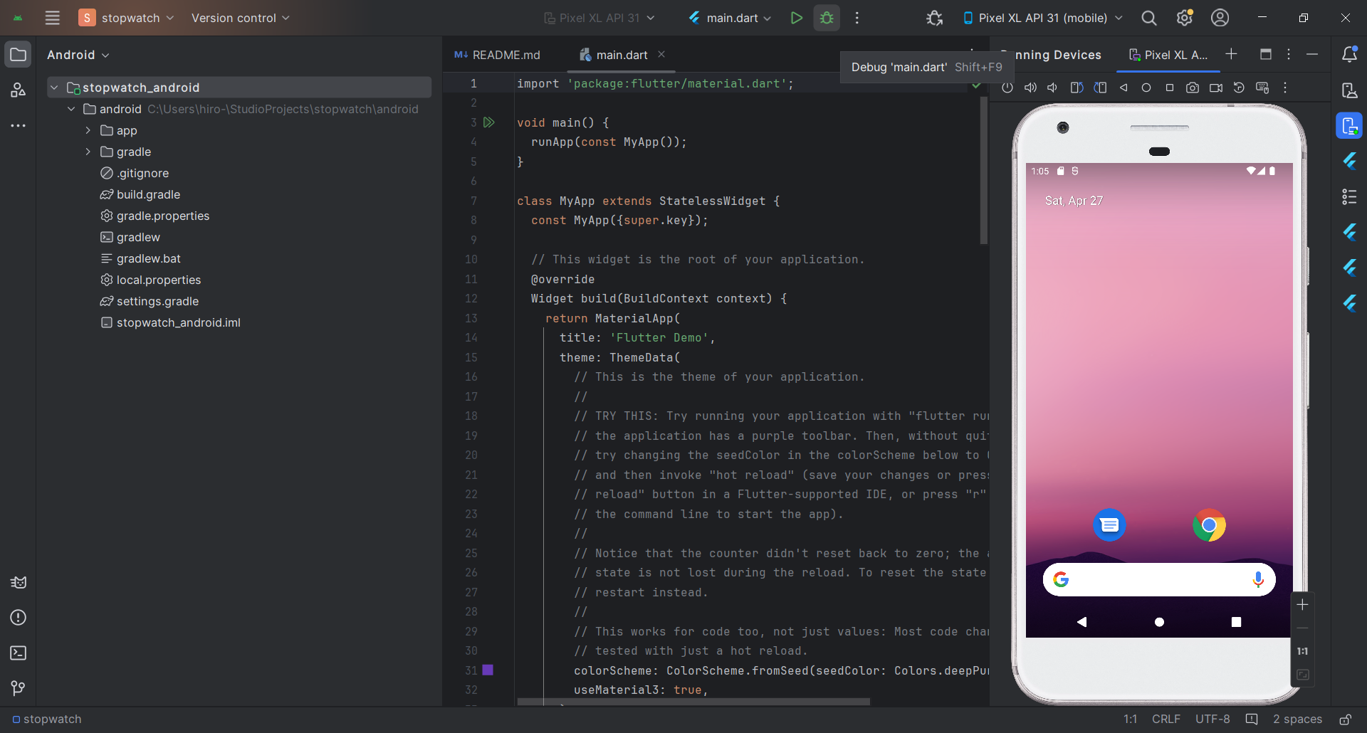画面上部の虫のマーク(Debug 'main.dart')をクリックします。