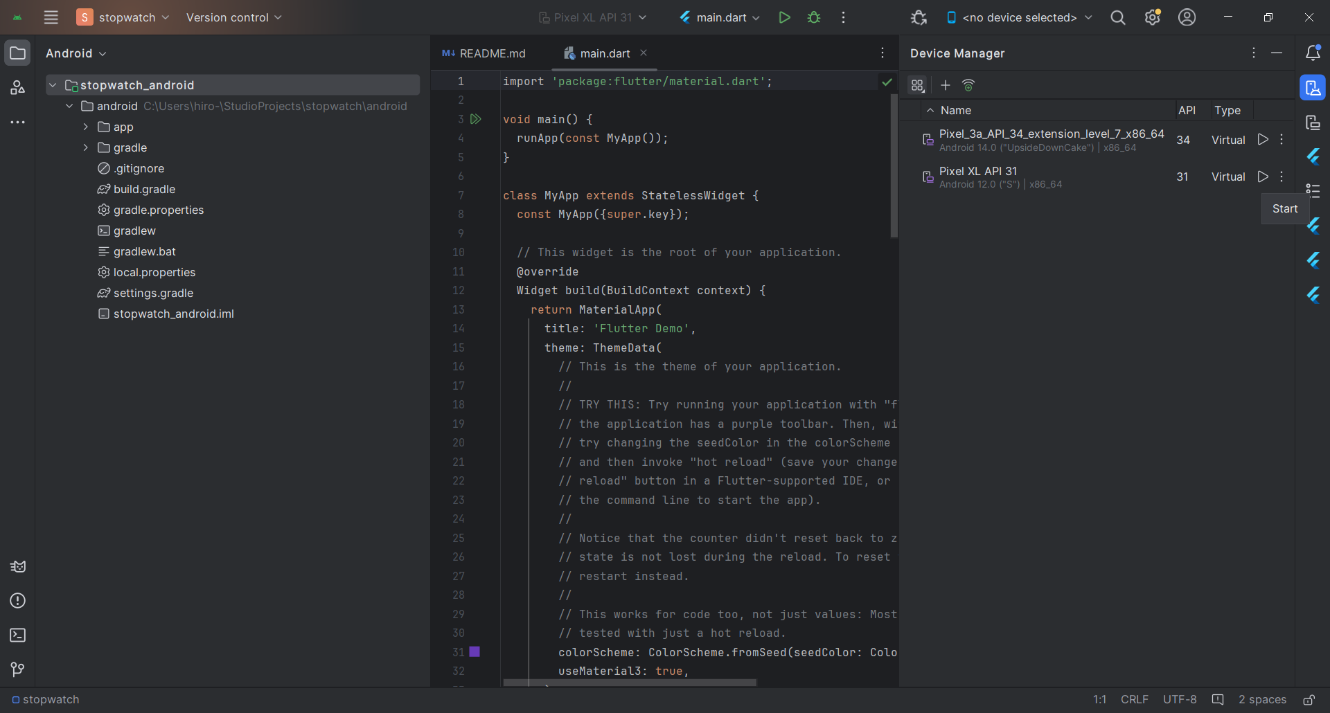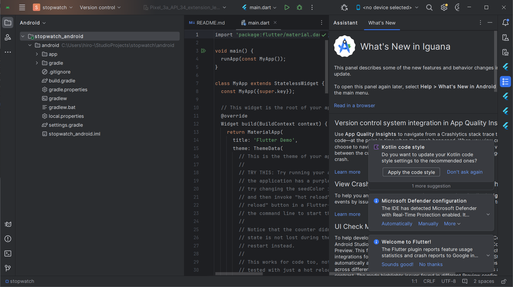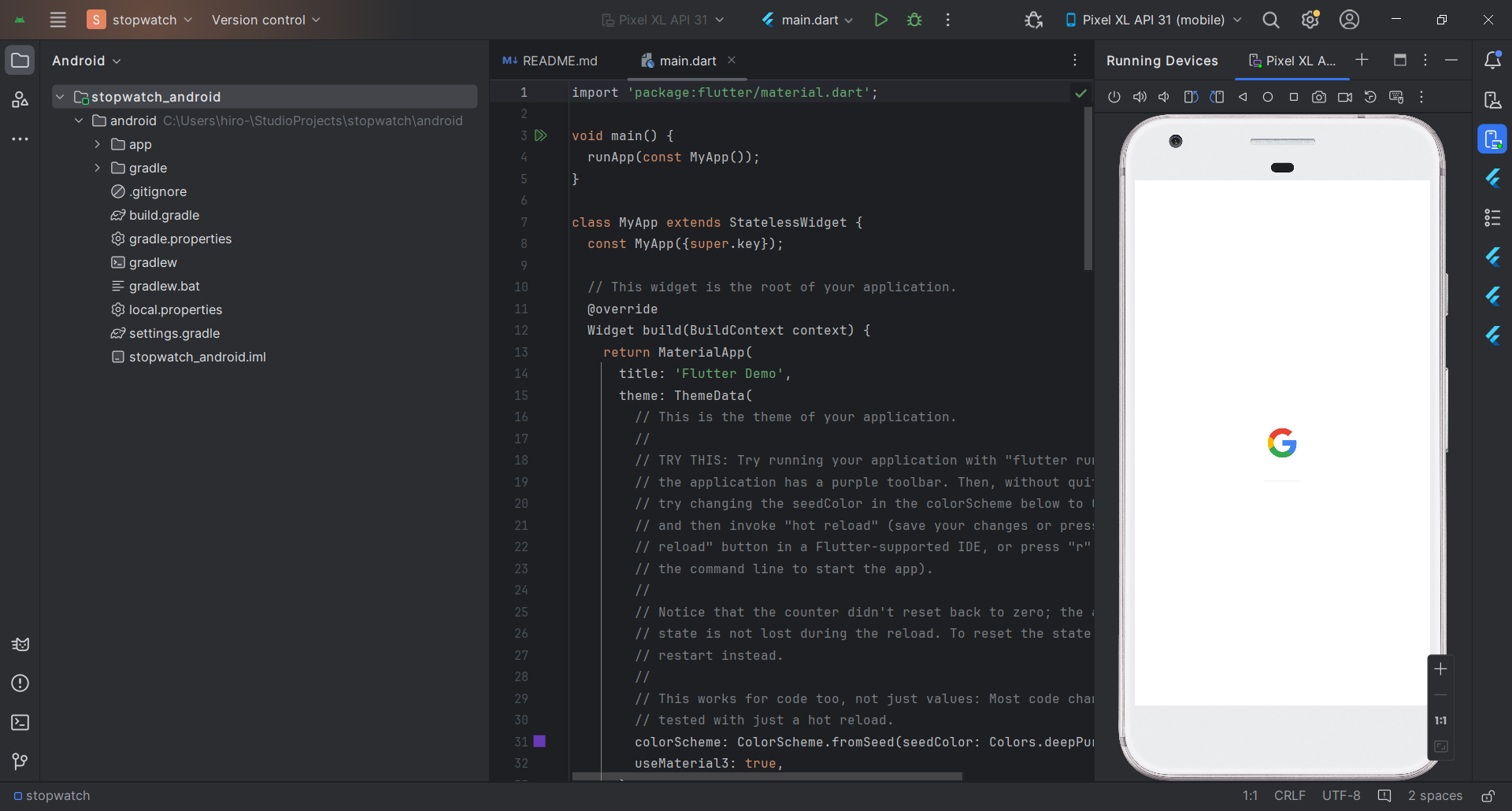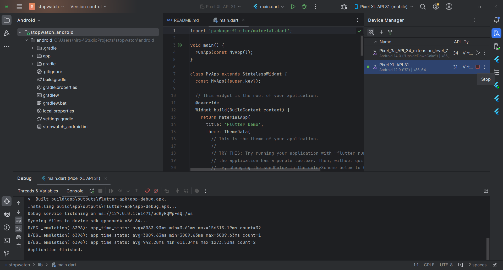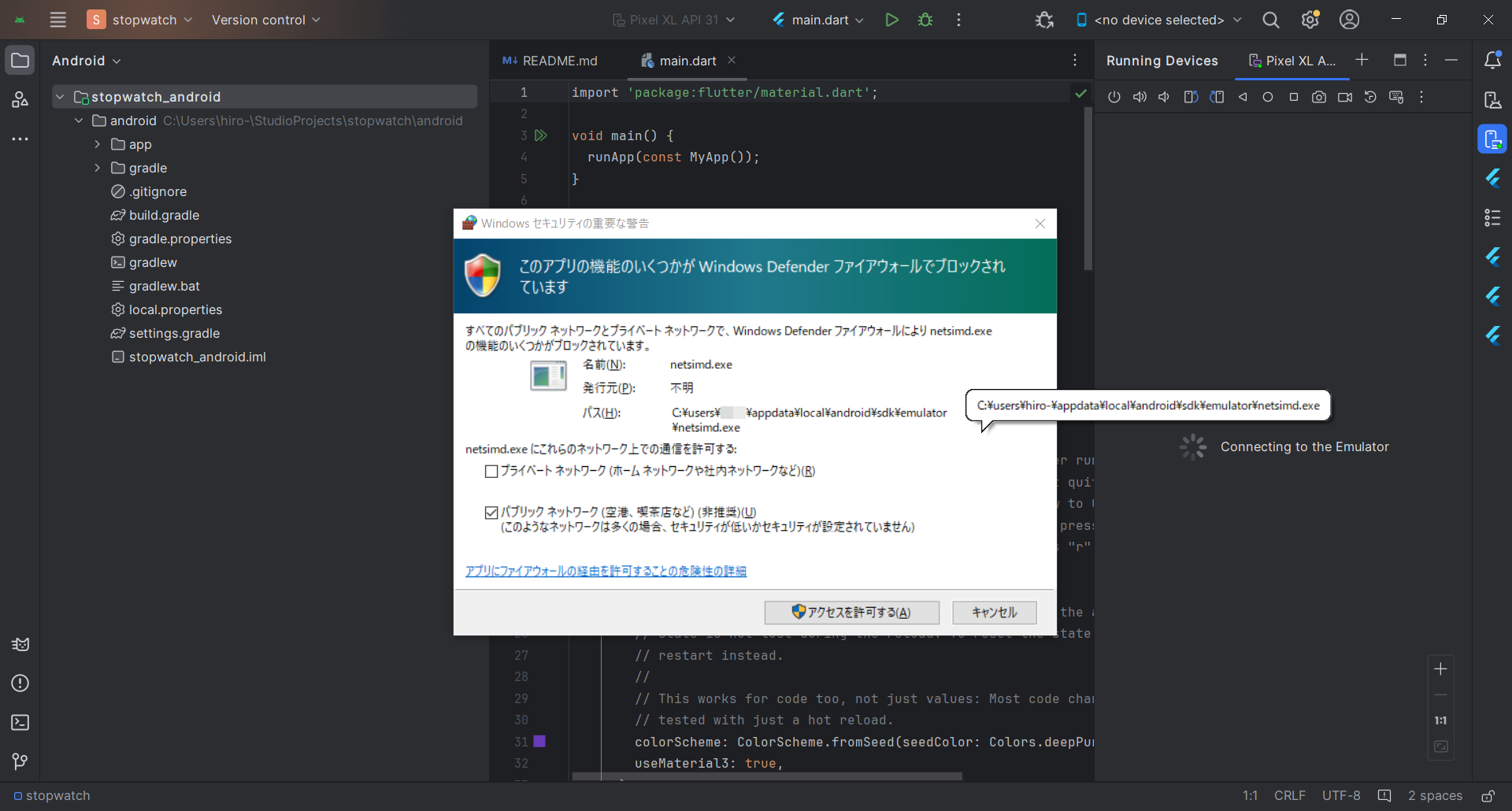 画面上部の虫のマーク(Debug 'main.dart')をクリックします。