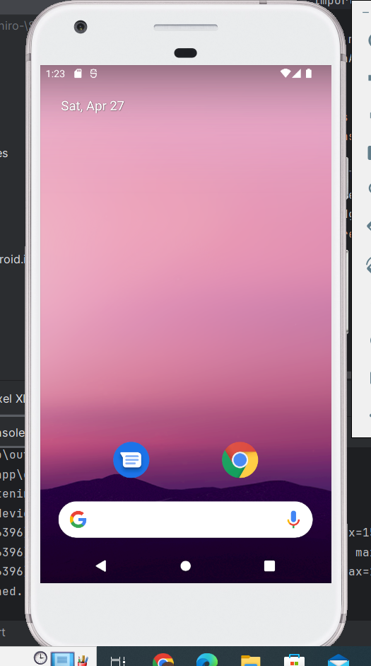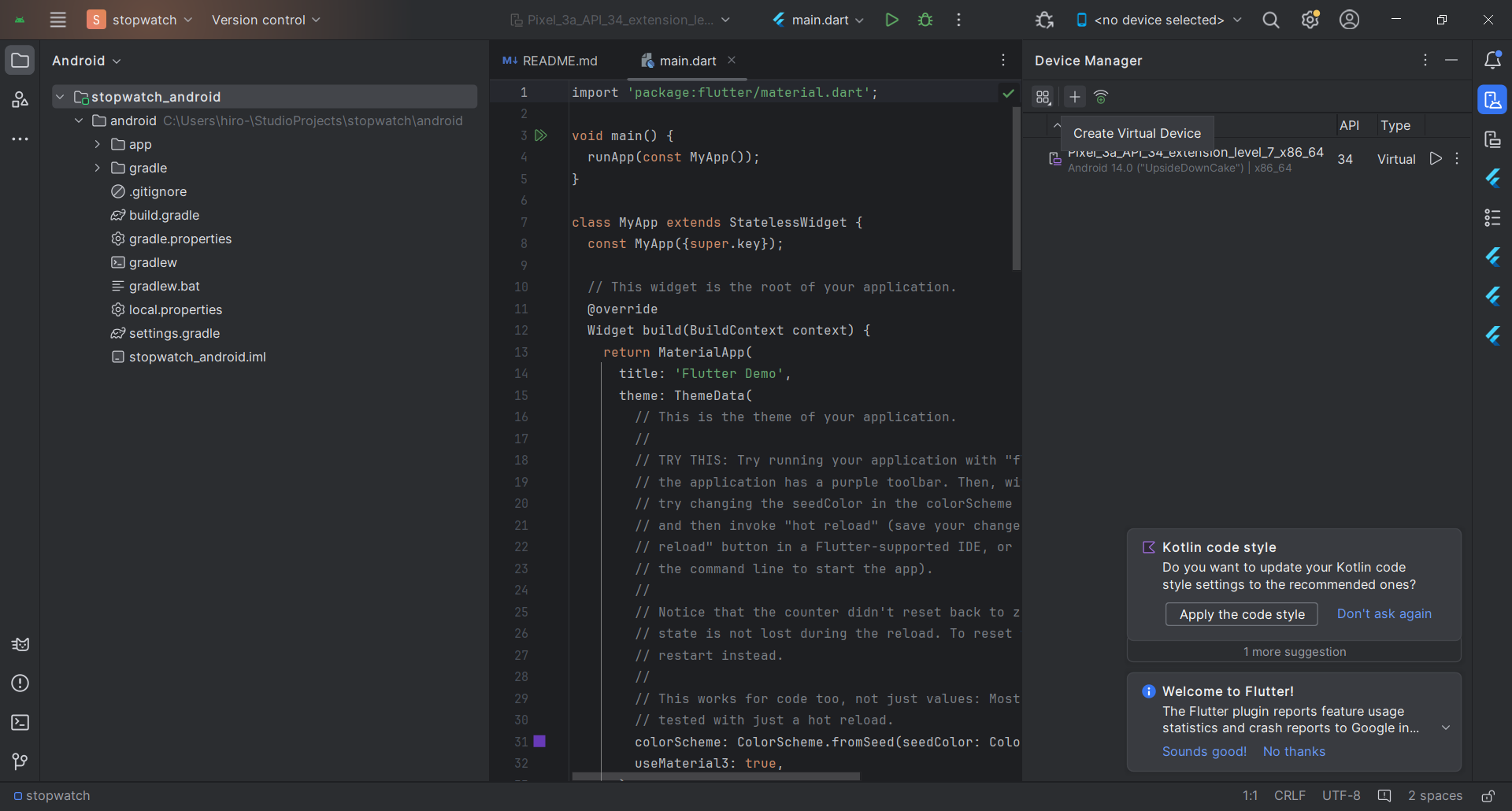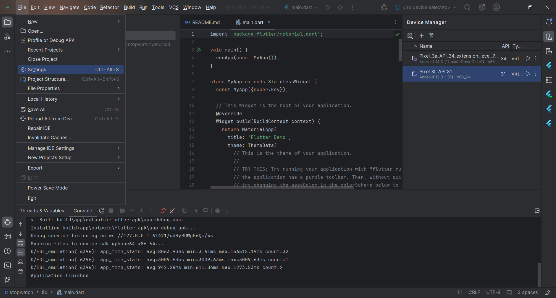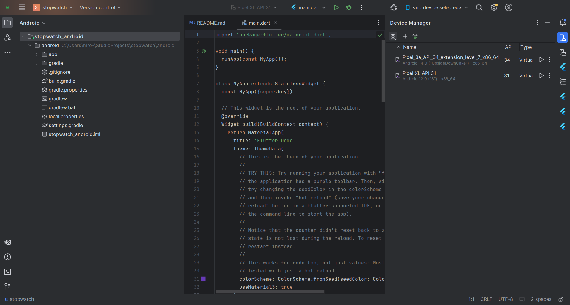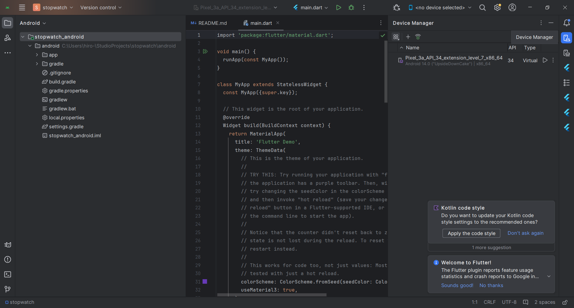 画面上部の虫のマーク(Debug 'main.dart')をクリックします。