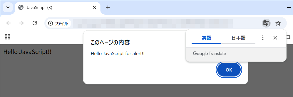 ブラウザで開いたところwindow.alertのメッセージが表示されましたのでOKを押します。