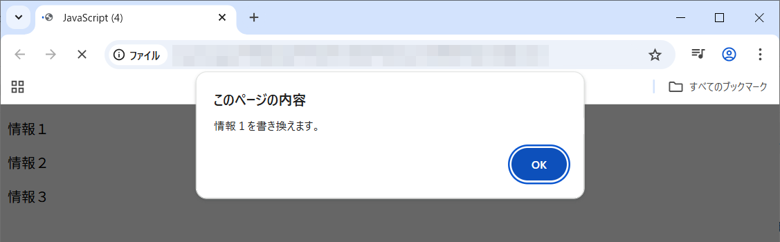 次のalertのメッセージが表示されましたがブラウザ上では書き換わりませんでした。OKを押します。