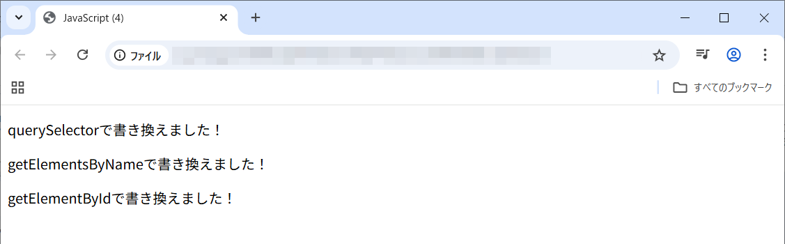 querySelectorとgetElementsByNameとgetElementByIdの方法で書き換えるようにしてみます。