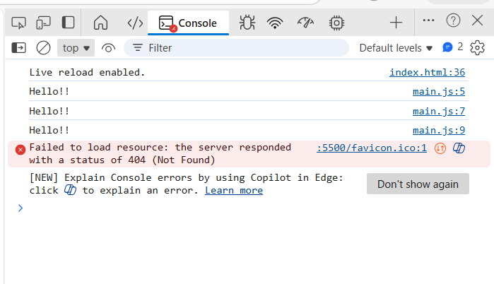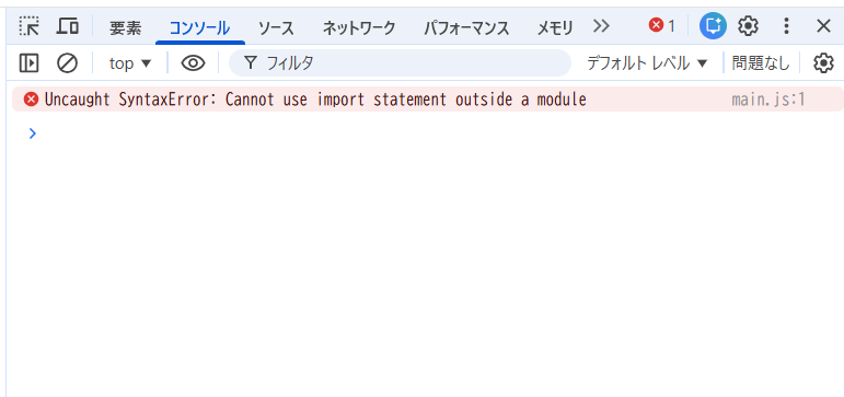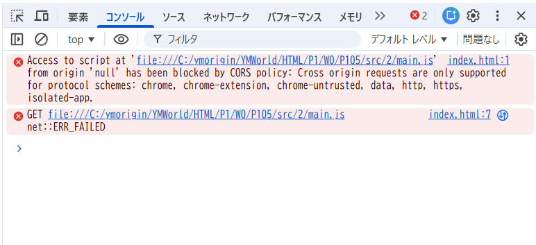 再度index.htmlをブラウザで開いてdeveloper toolsを開くと別のエラーが出ていました。