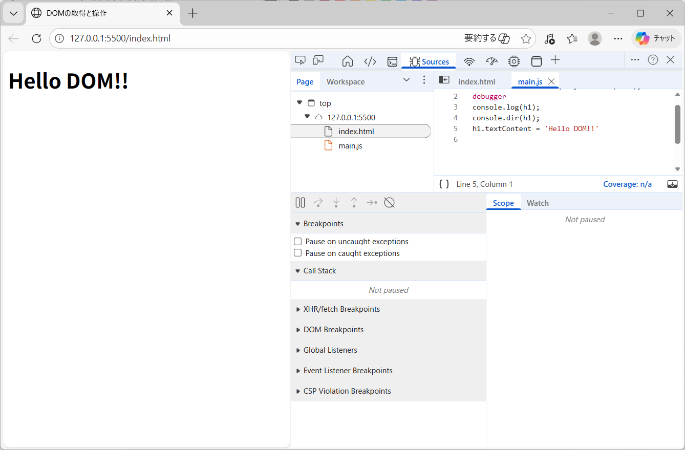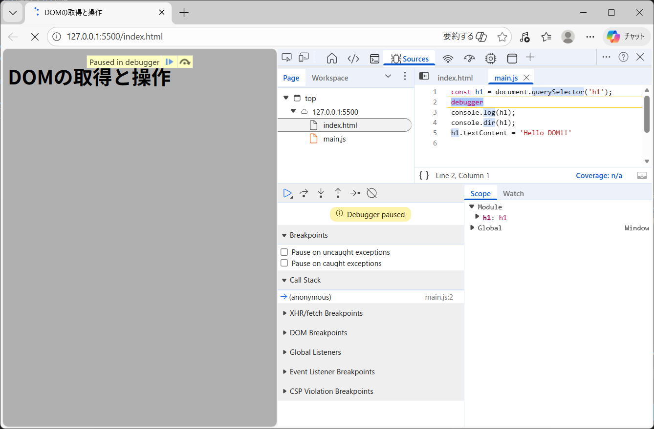 index.htmlを右クリックしOpen with Live Serverをクリック後、開いたブラウザでF12でDeveloper toolsを開きF5でリロードするとdebuggerの位置で止まります。