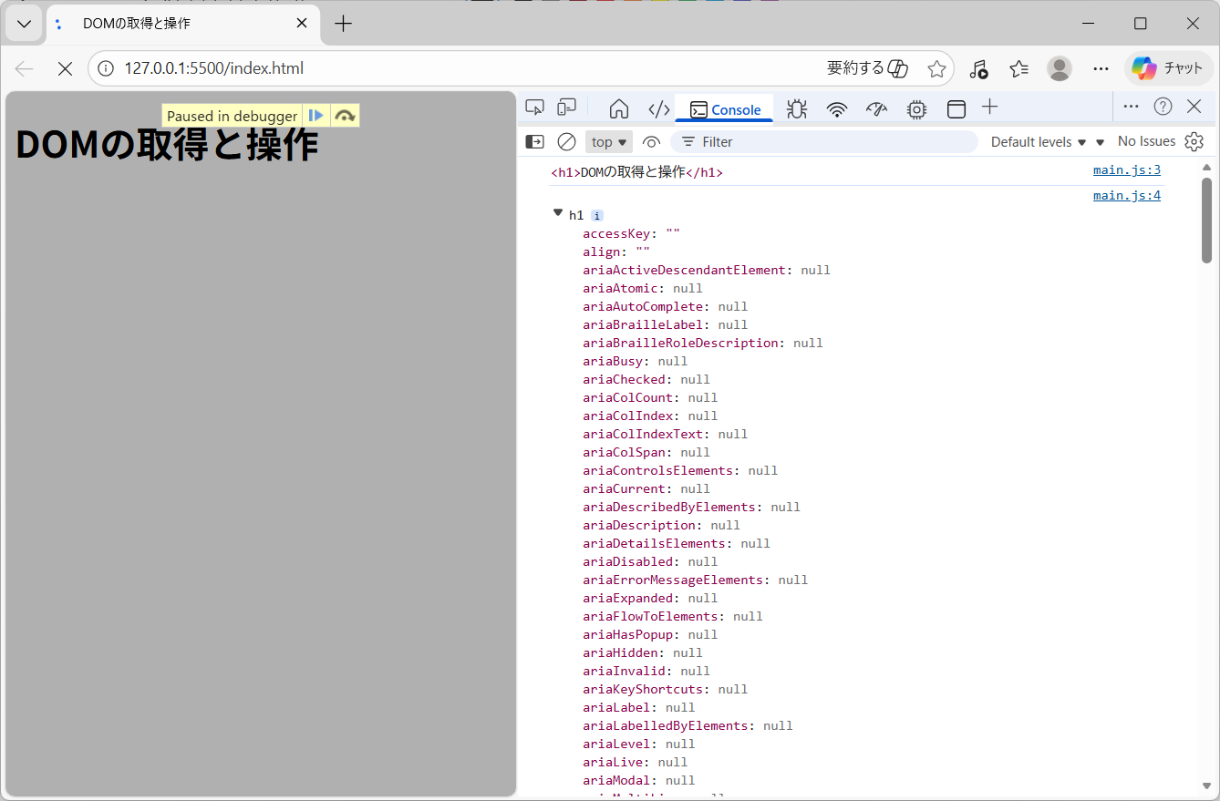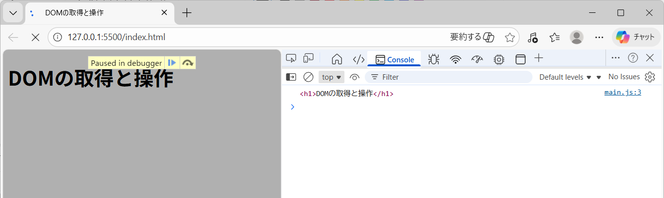 main.jsではquerySelectorでh1のDOMを取得し内容の表示とtextContentを書き換えてみます。