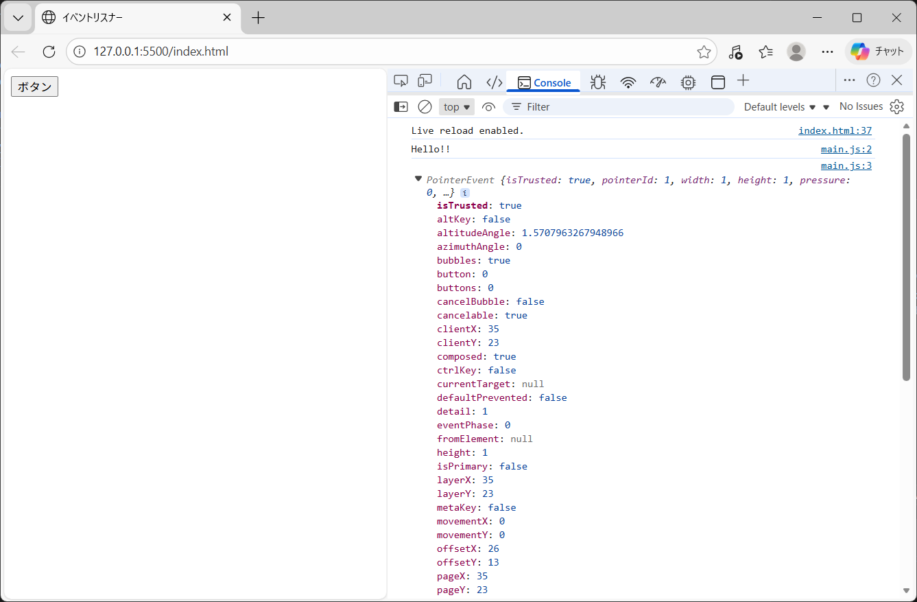 index.htmlを右クリックしOpen with Live Serverをクリック後、開いたブラウザでF12でDeveloper toolsを開きボタンをクリックしたところDeveloper toolsのConsoleにHello!!と表示されました!