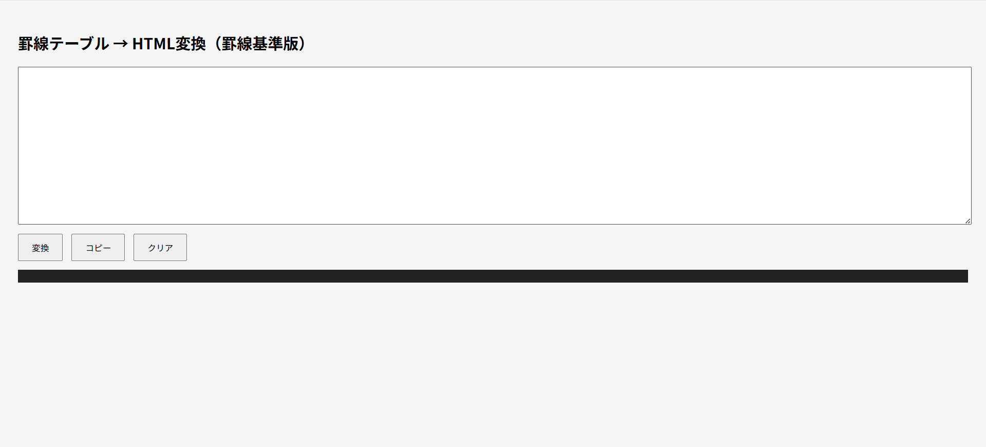 上の欄に罫線の表を貼り付けて変換をクリックすると下にHTMLに変換されたテキストが表示されました!