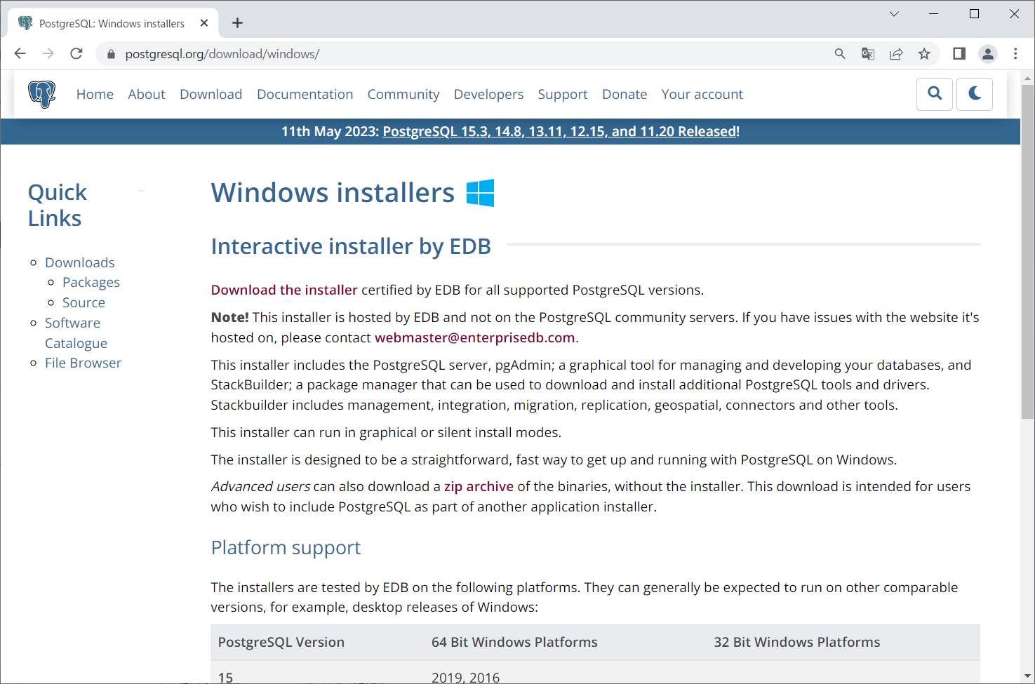 15.3の行のWindows x86-64の列にある下矢印をクリックします。
