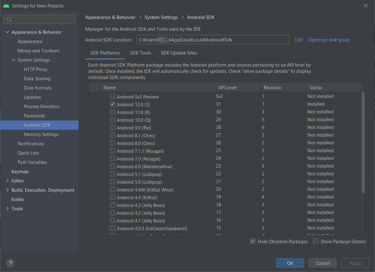 「Android 12.0 (S)」が Installed になっています。