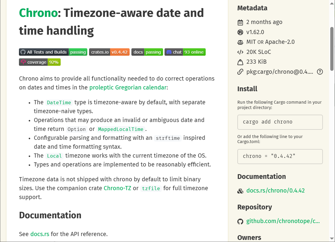 日付を扱うためにchronoクレートを使います。 crates.ioでchronoと検索します。