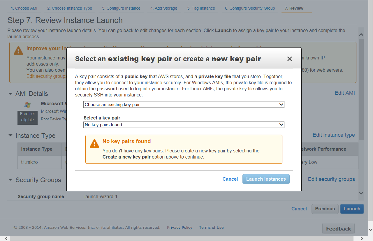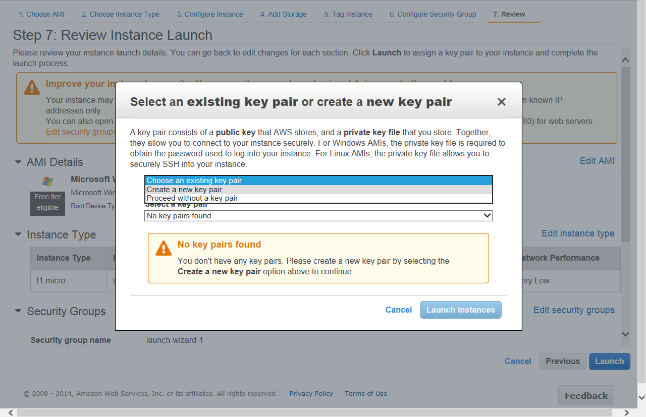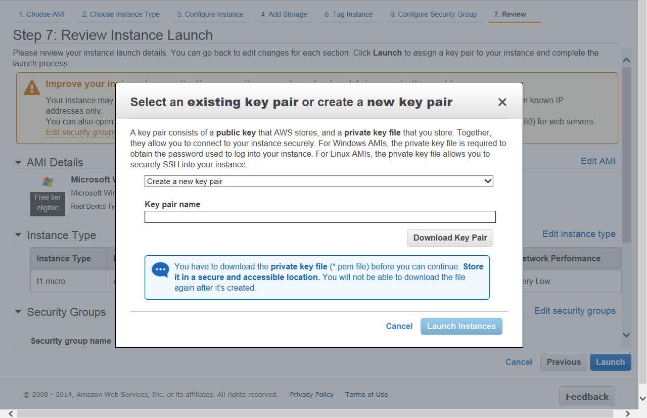 Key pair nameを入力しDownload Key Pairをクリックしキーペアをダウンロードしておきます。