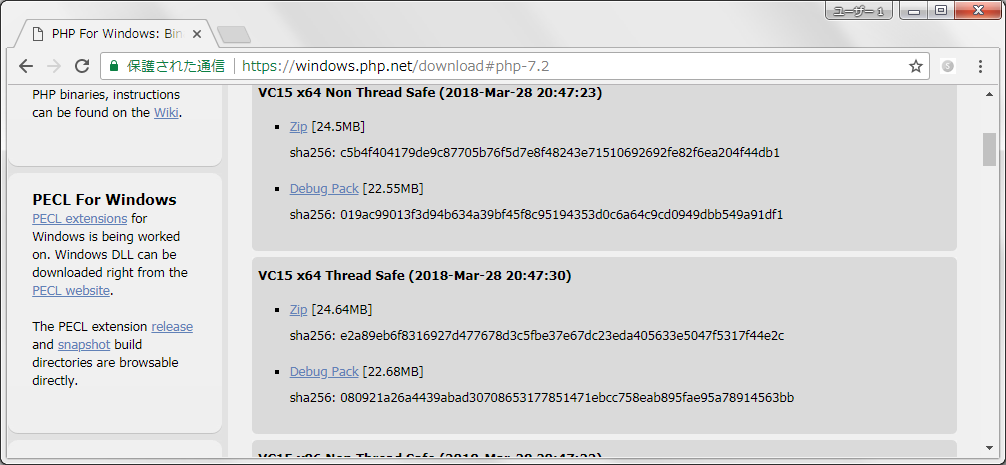 VC15 x64 Thread Safe (2018-Mar-28 20:47:30)の下にあるZipを選択します。