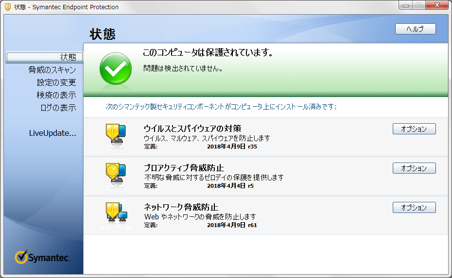 ウイルスとスパイウェアの対策欄にあるオプションをクリックし設定の変更を選択します。