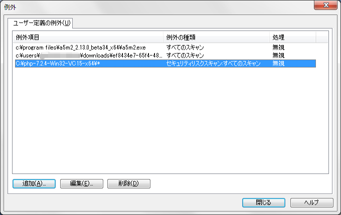 Symantecを無効にしておくのはよろしくないので、phpのフォルダだけ除外設定します。