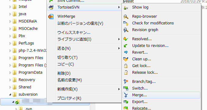 既にバージョン管理下になっているフォルダ(フォルダの先頭に緑のチェックマークなどが付いているフォルダ)を右クリックし[TortoiseSVN]-[Merge]を選択します。