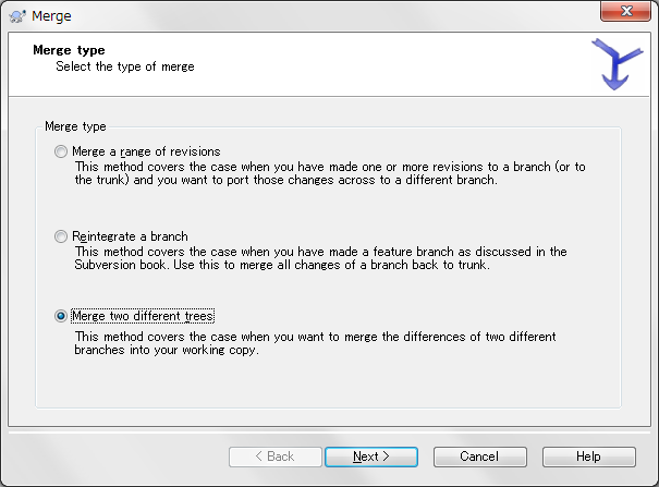 今回は別のbranchesからマージしたいので、Merge two different trees をチェックしNextボタンを押します。