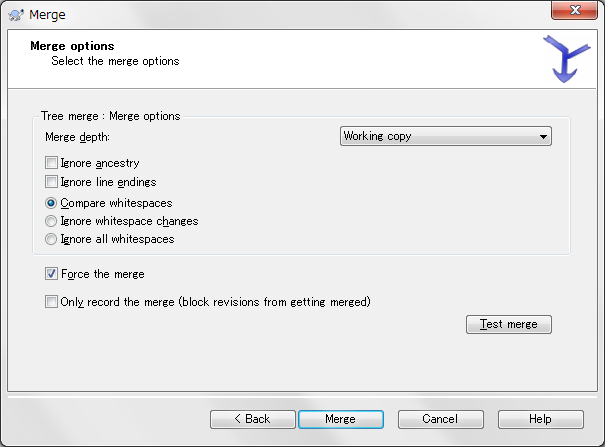 一度フォルダをRevertしました。 Fromにはマージ結果を格納するURLを、ToにはマージしたいURLを指定してもう一度Mergeを実行したところ思い通りに動作した模様です。