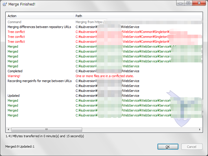 Tree conflictやWarning!が出ました。 内容を確認しましたが、どうやらMergeに指定するURLが逆だったようです・・・