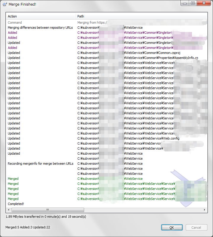 Mergeボタンを押すとMergeが実行されます。 ずらずらとMerge結果が表示されます。