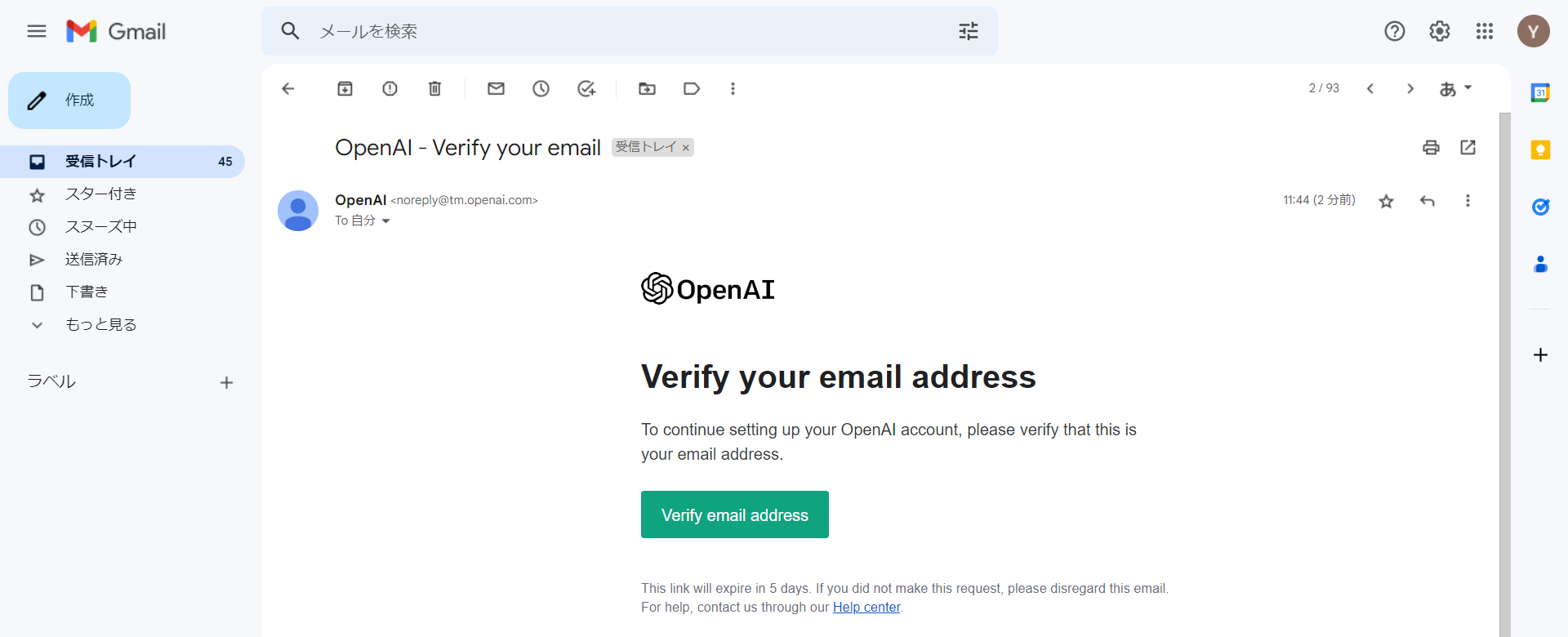 OpenAIからメールが来ていたました。「Verify email address」をクリックします。