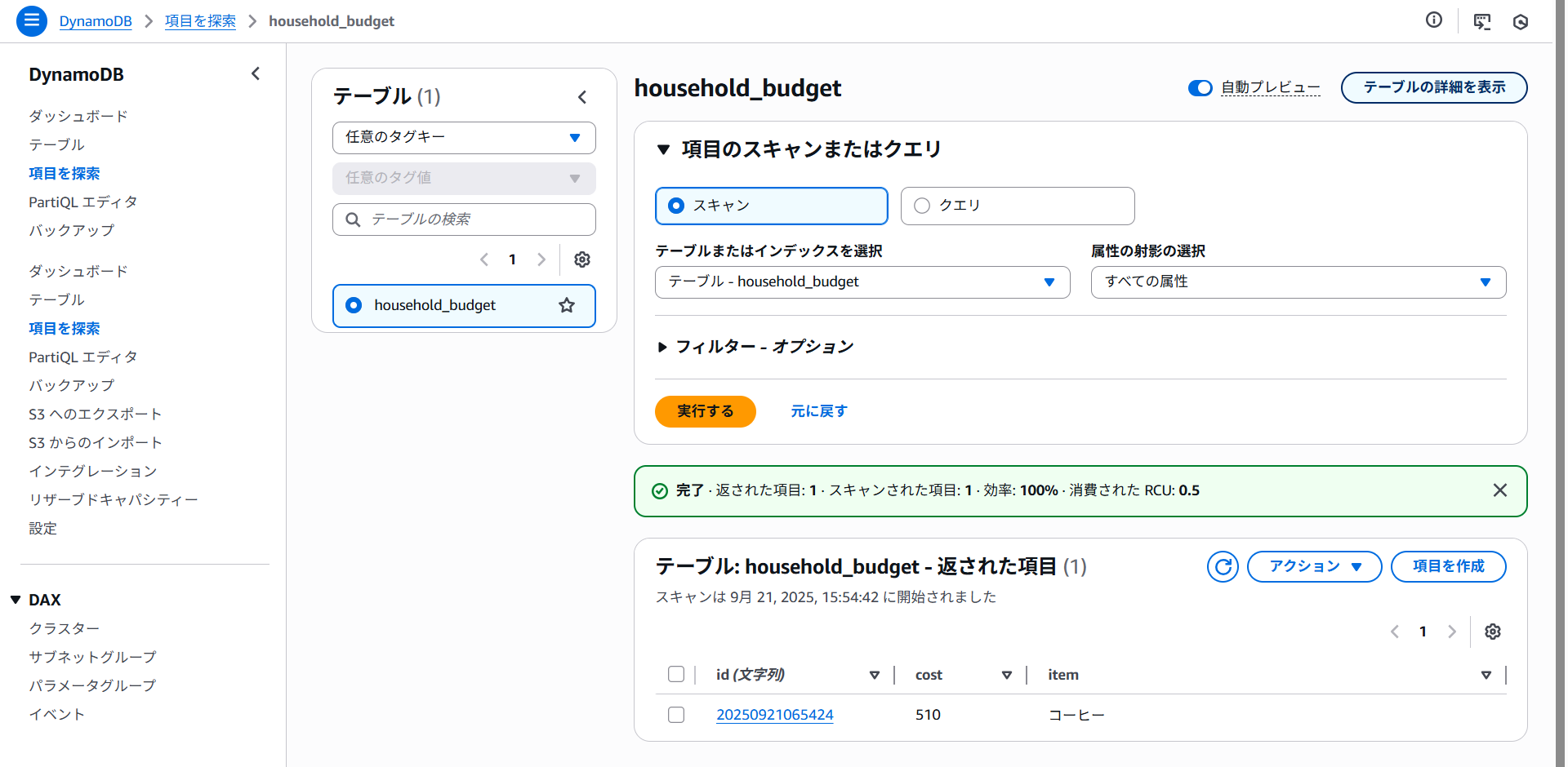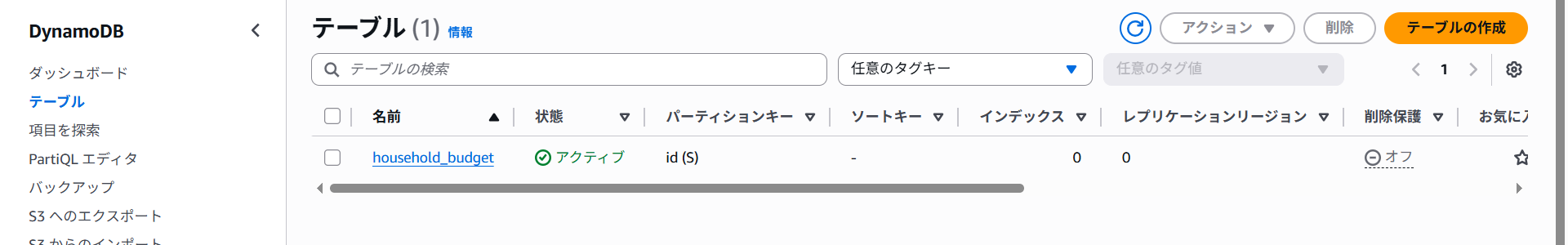 AWSマネジメントコンソールで確認するとhousehold_budgetテーブルができていました!