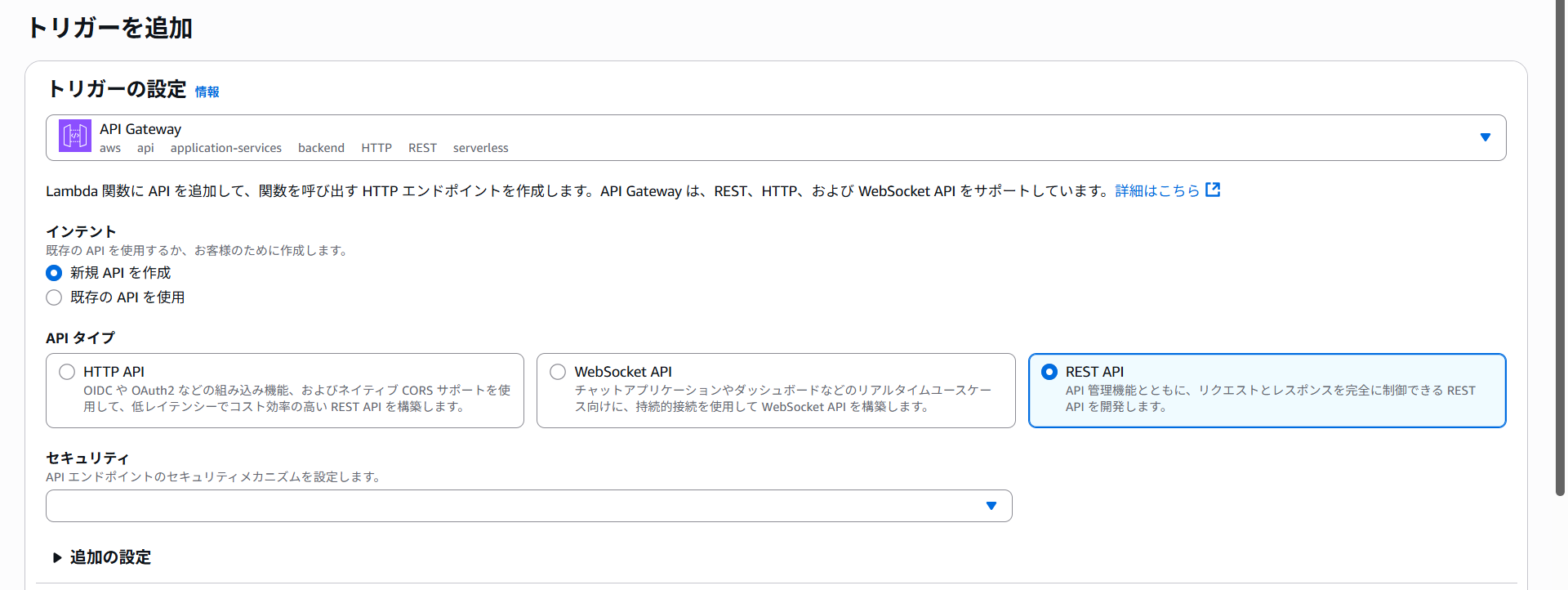 | インテント | 新規のAPIを作成 |