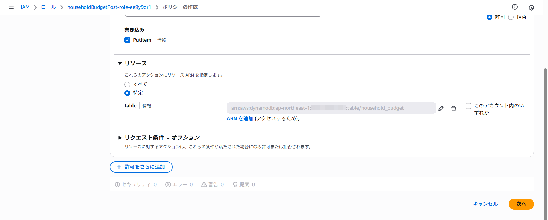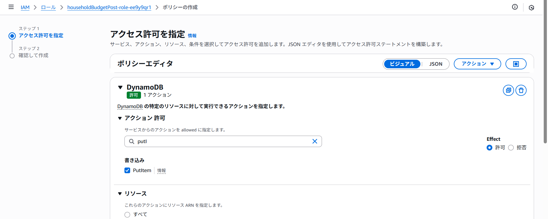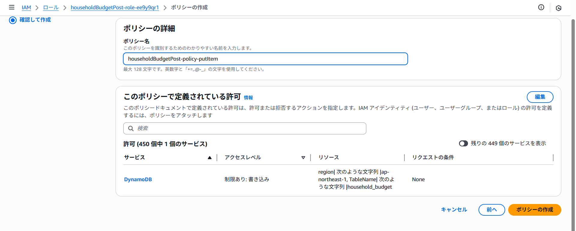 ポリシー名にhouseholdBudgetPost-policy-putItemと入力しポリシーの作成をクリックします。