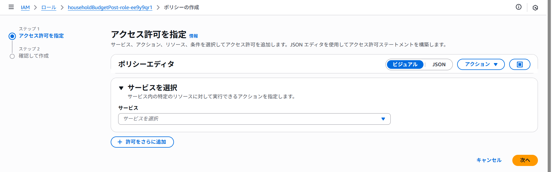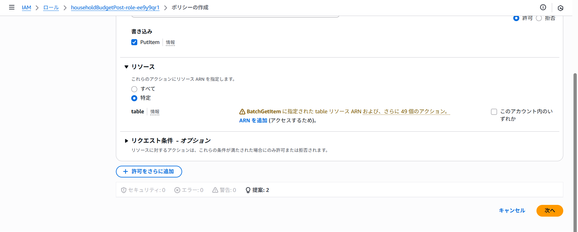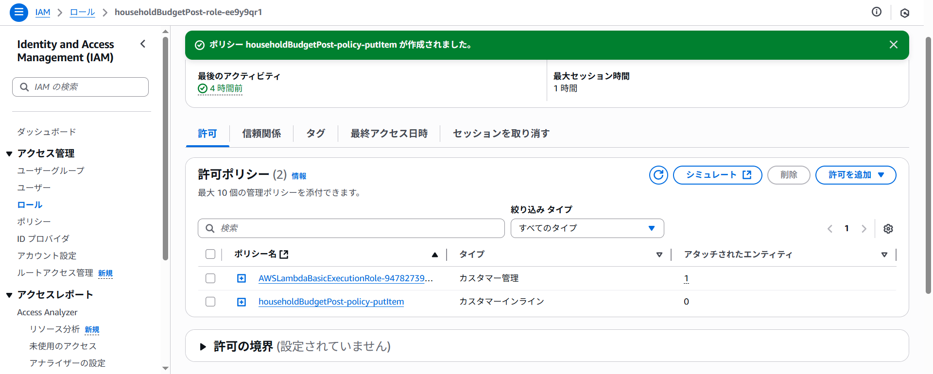 ポリシー名にhouseholdBudgetPost-policy-putItemと入力しポリシーの作成をクリックします。