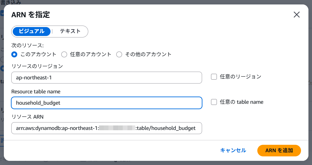 接続するDynamoDBの情報を入力しARNを追加をクリックします。 リソースARNにDynamoDBのページからARNをコピーして貼り付けるとリソースのリージョンとResource table nameが自動で設定されます。