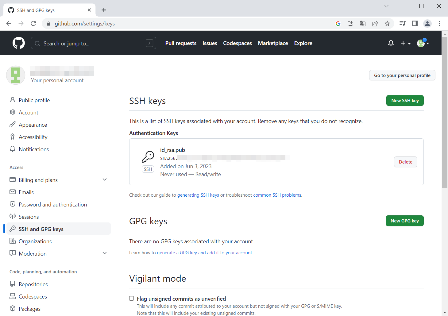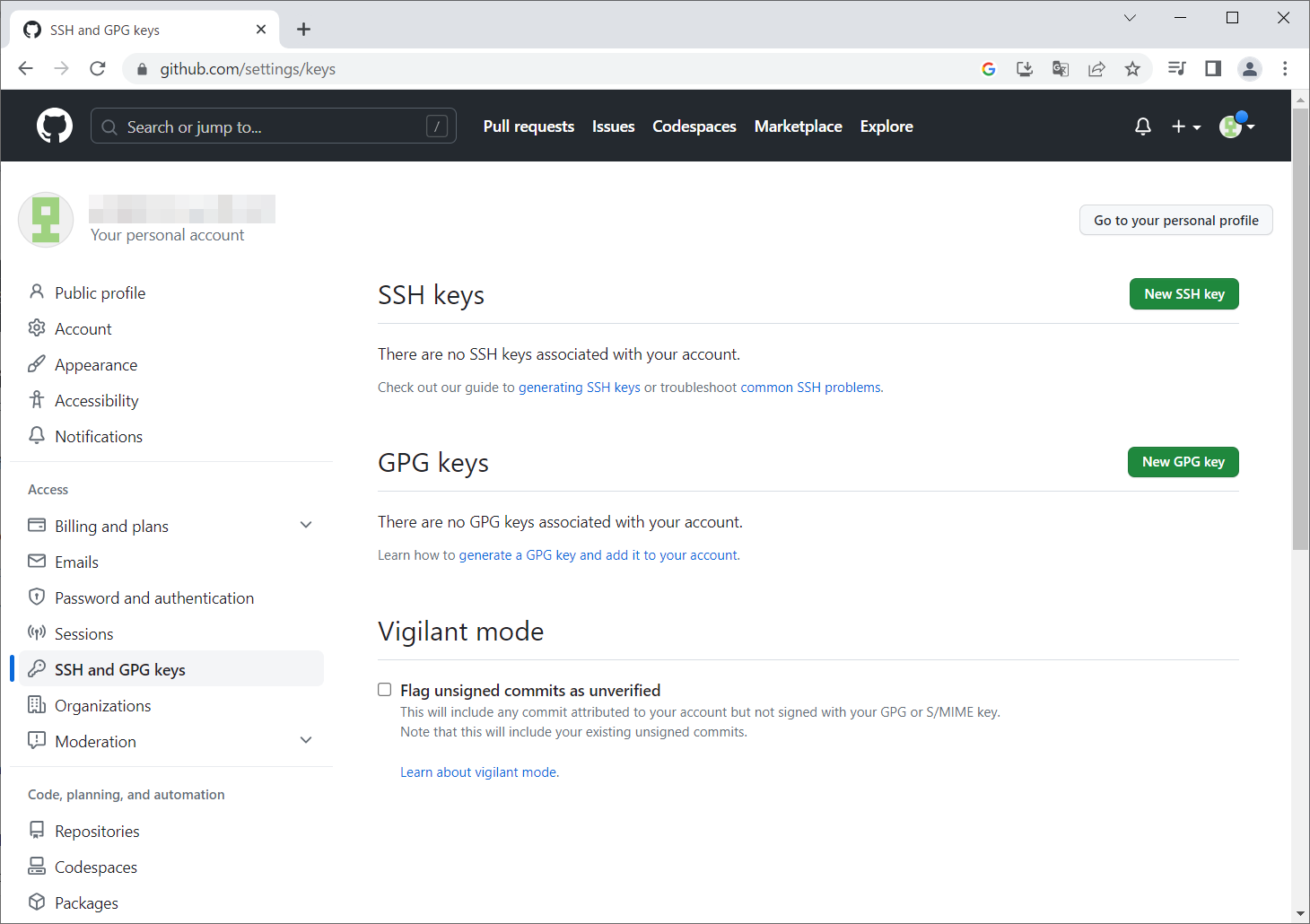 左のメニューでSSH and GPG keysをクリックします。 右に表示されたNew SSH keyをクリックします。