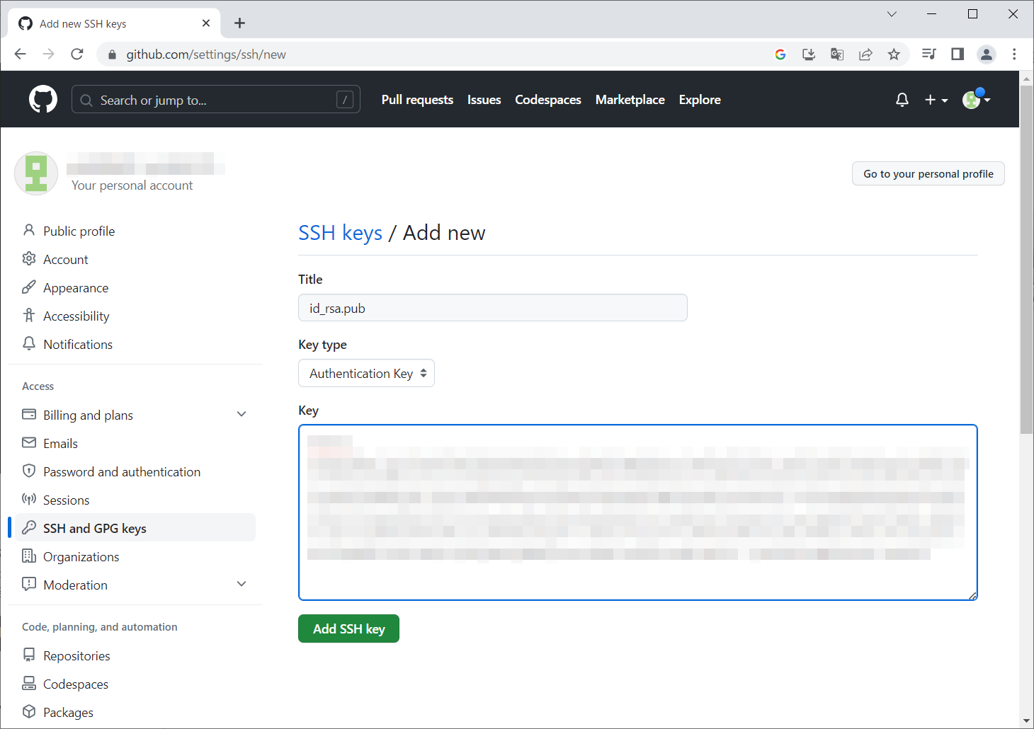Titleにid_rsa.pubと入力しKey欄には生成したキーを貼り付けAdd SSH keyをクリックします。