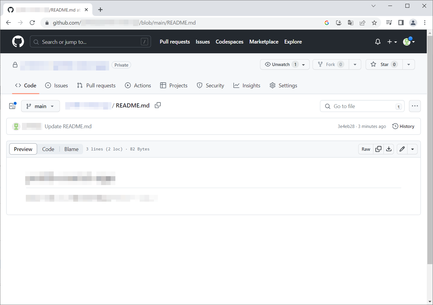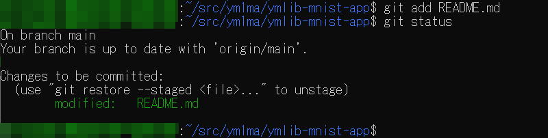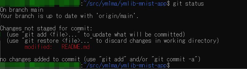 ローカルのREADME.mdファイルを書き換えてみます。 書き換え後、git statusで状態を確認します。
