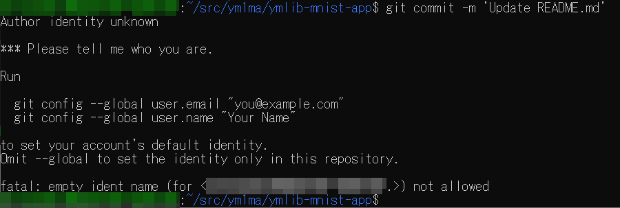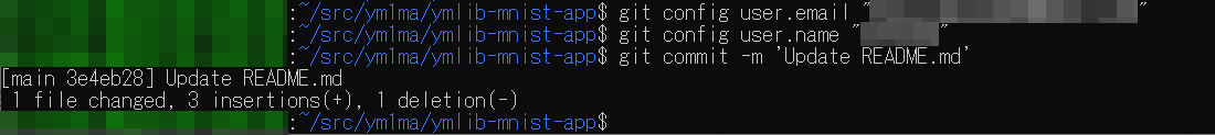 git configでuser.emailとuser.nameを設定しgit commitしてみます。