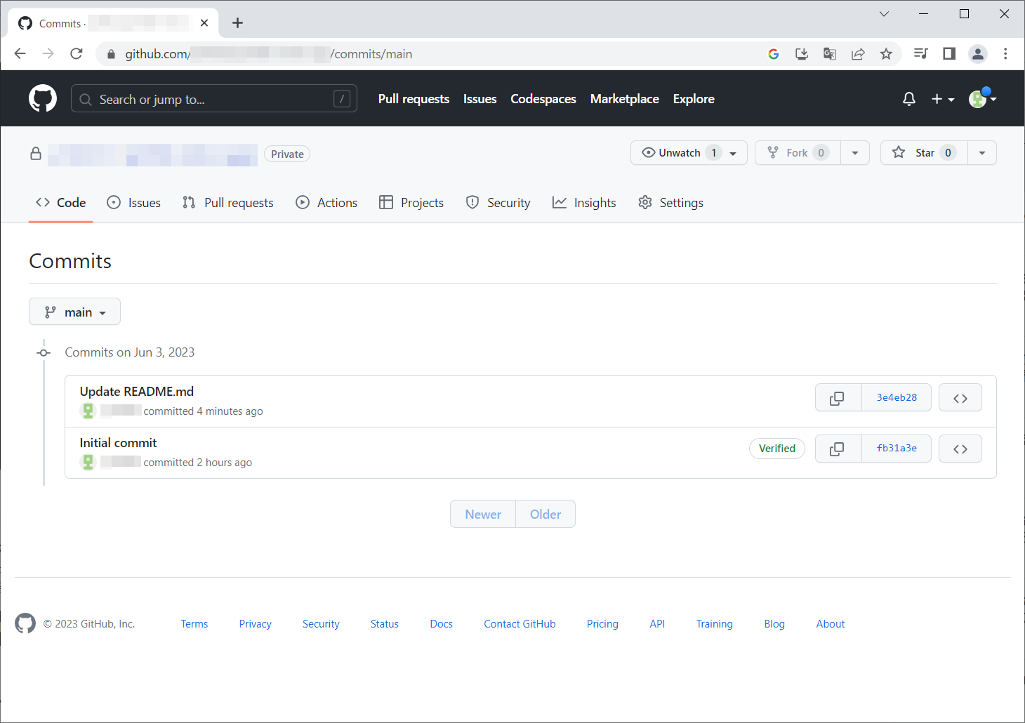 GitHubで状況を確認してみます。 2 commitsと表示されています。
