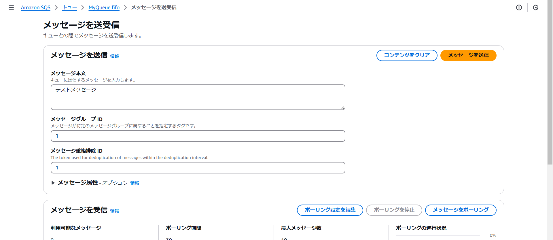 SQSを開き「メッセージを送受信」をクリックしメッセージを送受信画面でメッセージを入力し「メッセージを送信」をクリックします。