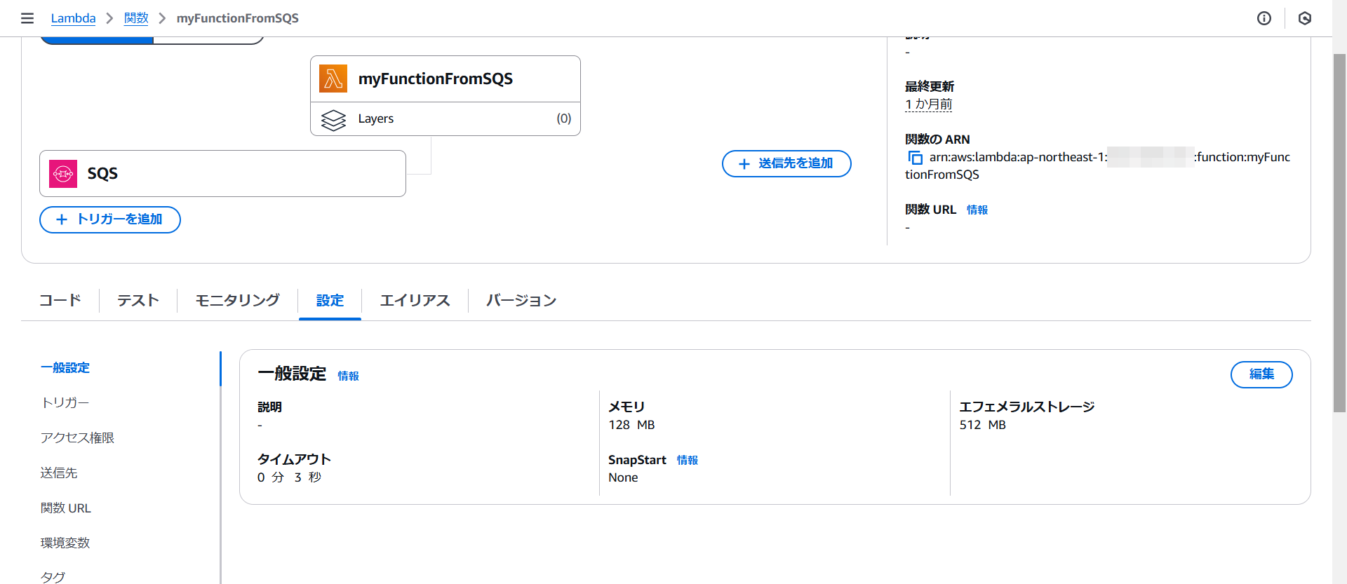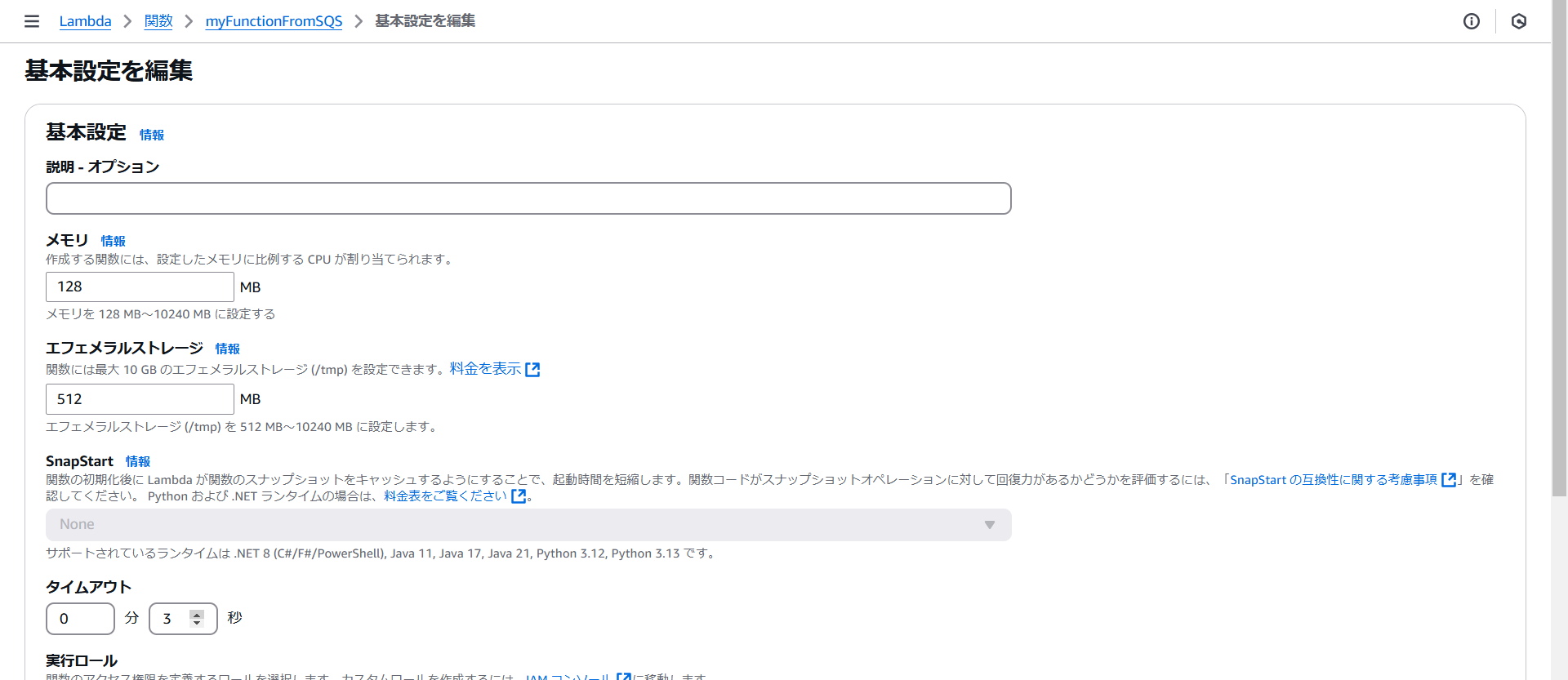 Lambdaの[設定]を選択します。一般設定の欄にタイムアウトが「 0 分 3 秒」と表示されています。同じ欄にある「編集」をクリックします。