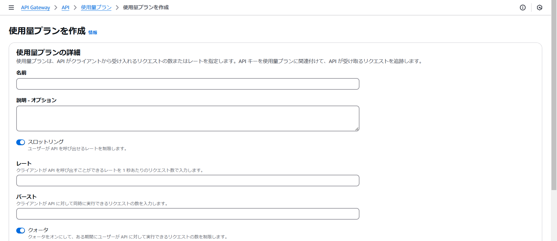 必要な情報を入力し画面の下の「使用量プランを作成」をクリックします。