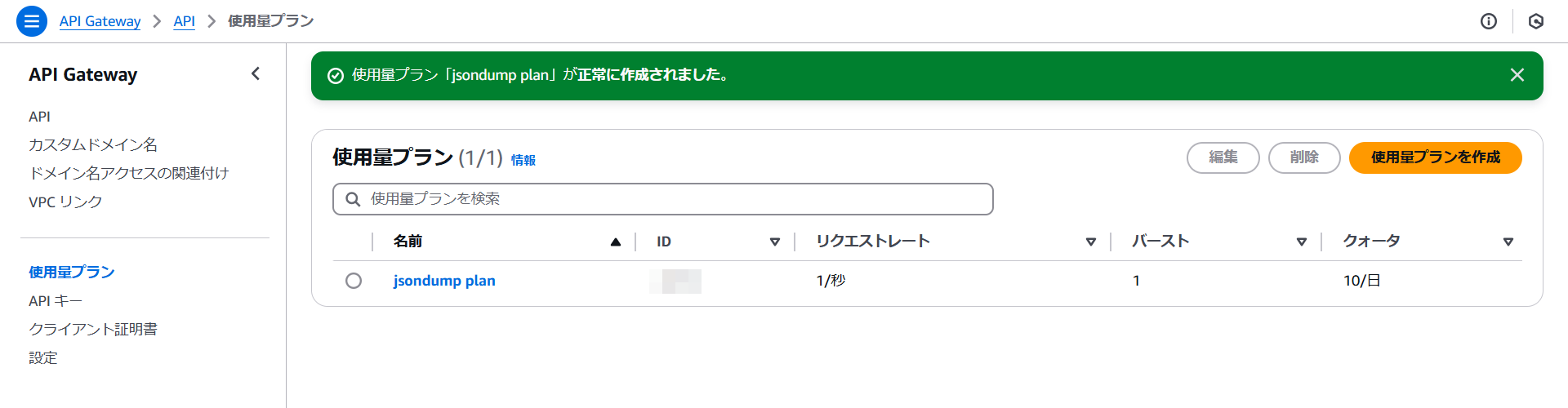 使用量プランが作成されました。