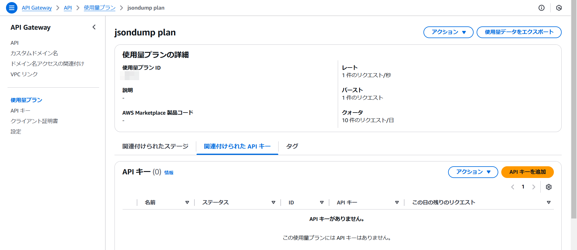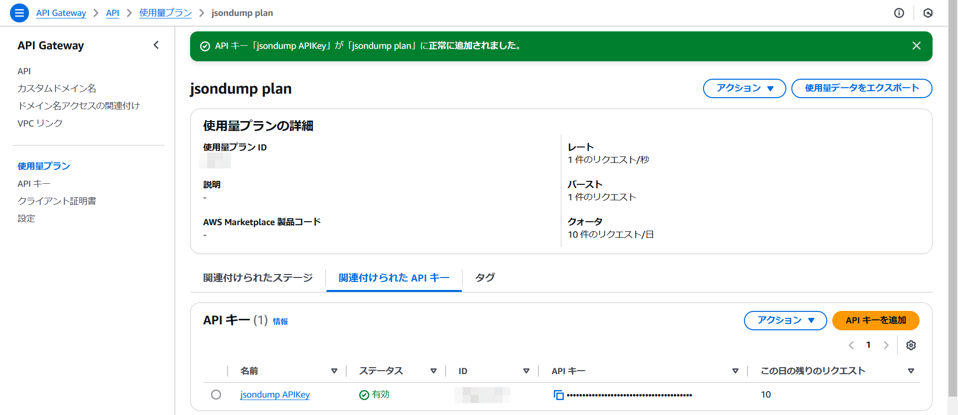 使用量プランにAPIキーが追加されました。