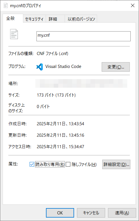 my.cnfを右クリックしプロパティを開き読み取り専用に変更します。