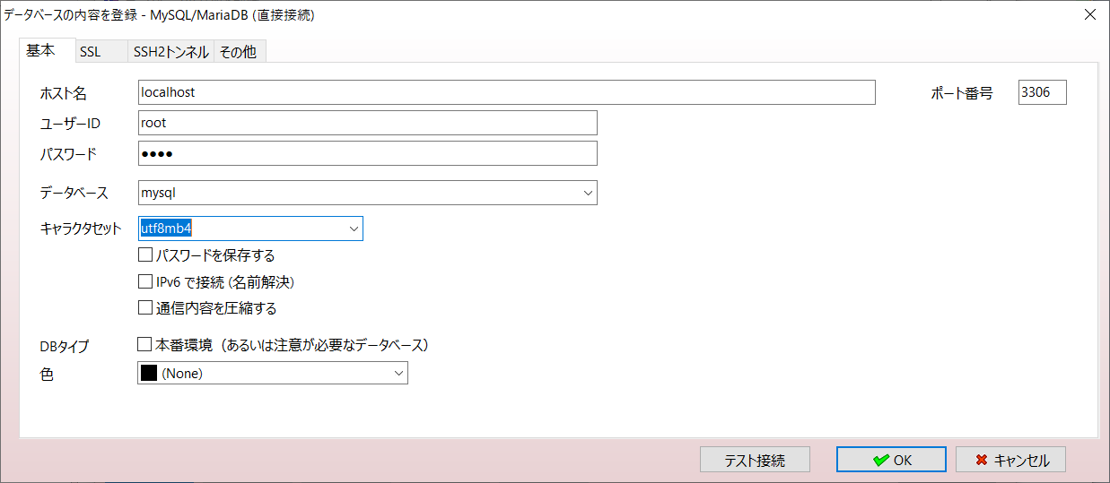 データベースの情報を入力し「テスト接続」を押下します。