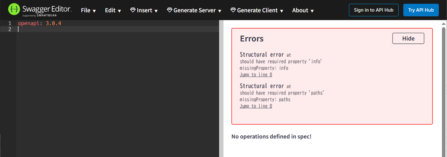 左に「openapi: 3.0.4」と入力したら右にエラーが出ました。