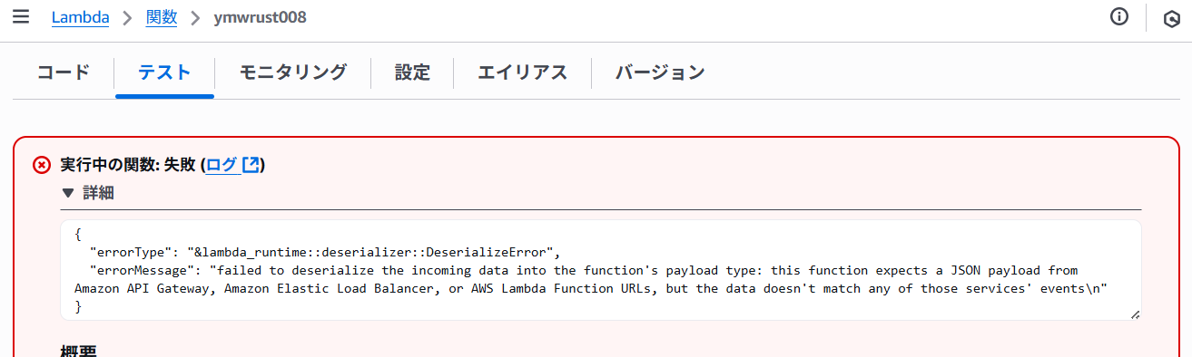 AWSマネジメントコンソールでLambdaのテストをしたところエラーが出ました。
