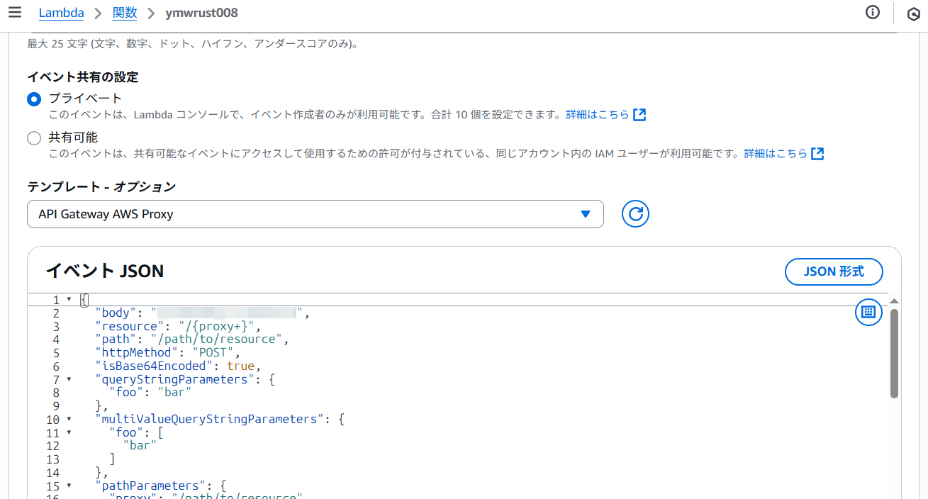 テンプレート - オプションを見てみたところAPI Gateway AWS Proxyというものがあったので選択したところイベントJSON欄になにやらJSONが表示されました。